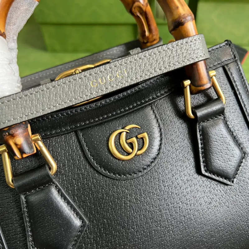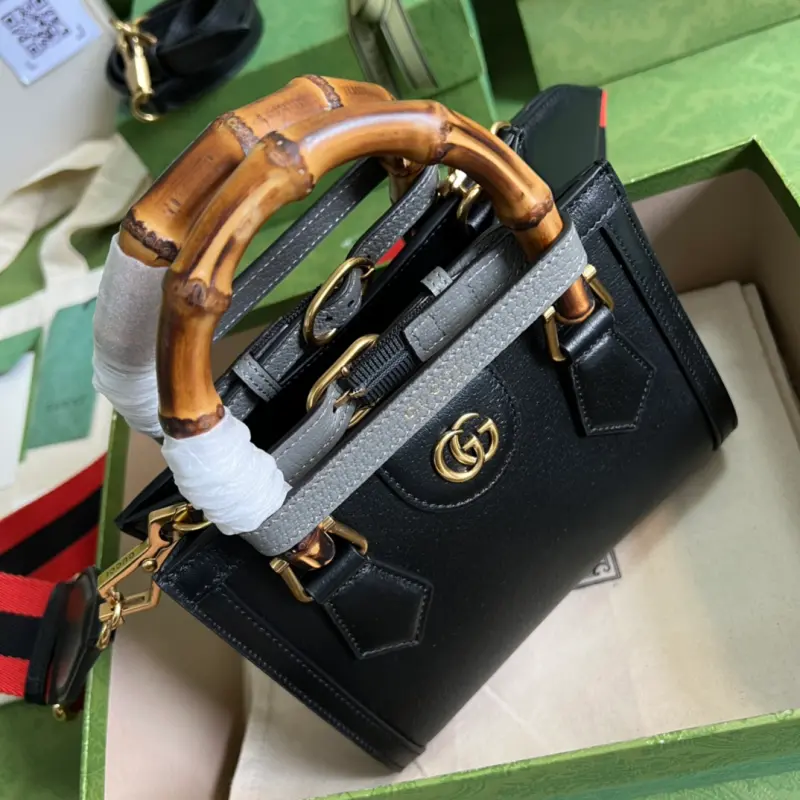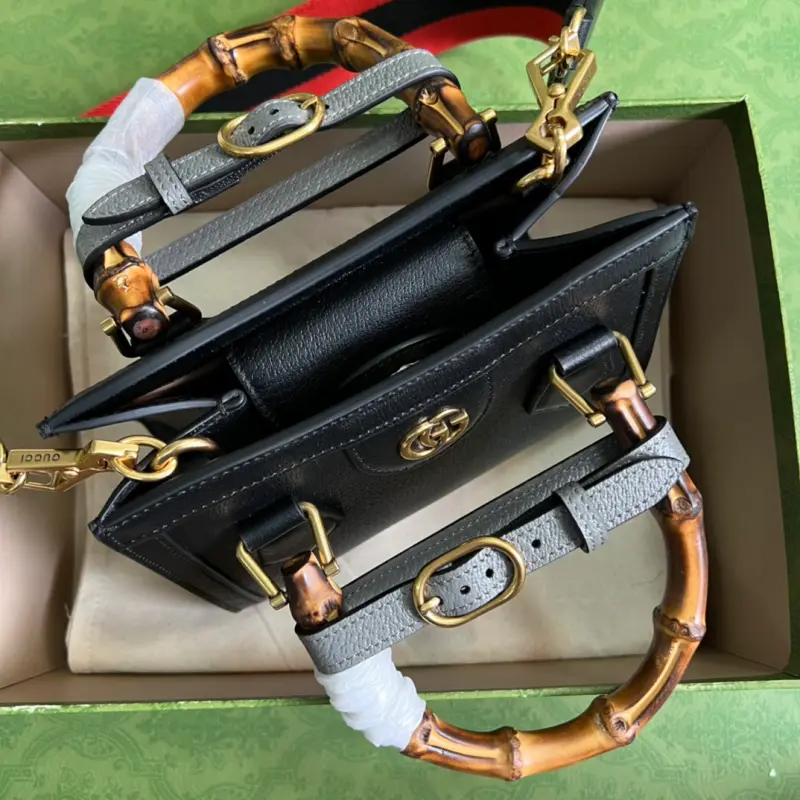 This small original leather bamboo tote bag, part of Gbag’s “Aria” collection, features a modern interpretation of a classic element. The bamboo element is a Gbag signature, appearing in various collections since the 1940s. After more than eight decades of evolution, this classic element is reimagined in black leather for this small tote. The bag also comes with two interchangeable shoulder straps: a smooth leather strap for an elegant and timeless look, and a striped webbing strap for a strong brand identity. Model No. 702732. Dimensions: 20*16*10cm. Color: Black leather with a gray strap.
