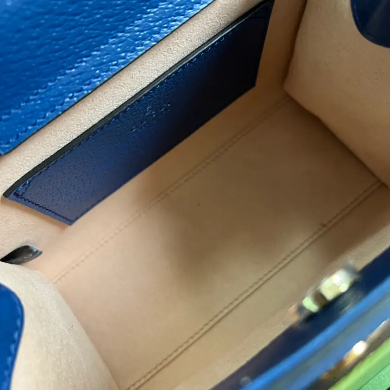 This small, original leather bamboo tote bag from Gbag’s “Aria” collection offers a modern interpretation of a classic element. The bamboo element, a Gbag signature, has been featured in various collections since the 1940s. After more than eight decades of evolution, this classic element is reimagined in black leather for this small tote. The bag also features two interchangeable shoulder straps: a smooth leather strap for an elegant and timeless look, and a striped webbing strap for a strong brand identity. Model No. 702732. Dimensions: 20 x 16 x 10 cm. Color: Royal blue leather with a khaki strap.