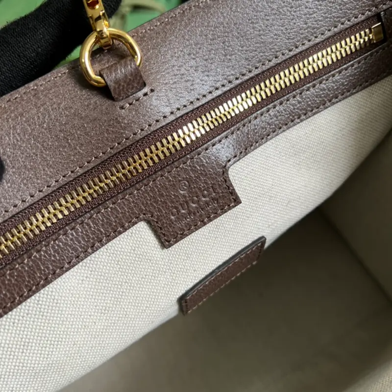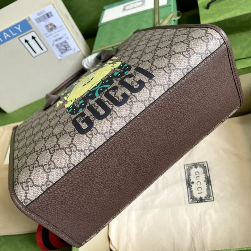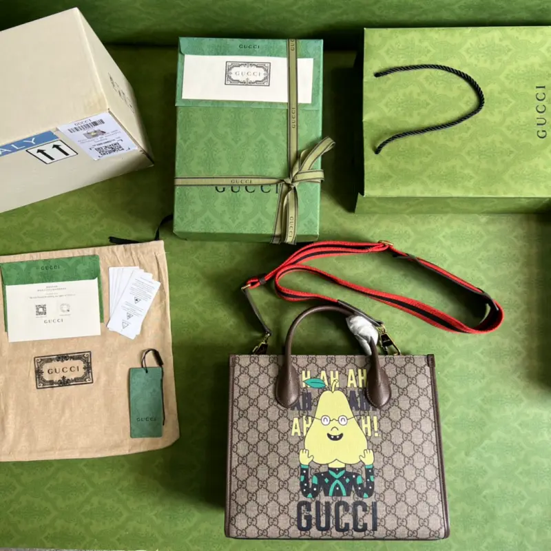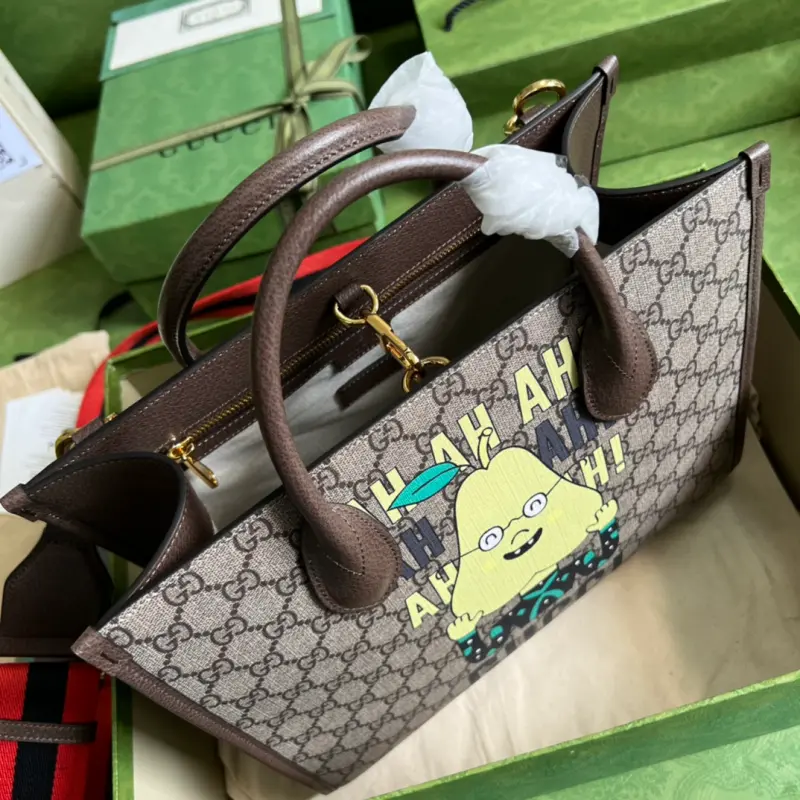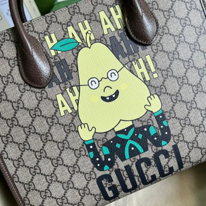 “Comes with full original green box packaging” Gbag pineapple-print shopping bag. The work of Chilean cartoonist and illustrator Pablo Delcielo injects a touch of playful color into the “Gbag Love March” fashion collection. Vibrant mythical creatures and playful fruit characters are used as bright and colorful patches or prints to bring a whimsical and romantic touch to ready-to-wear and accessories. The exquisite pineapple print is a playful addition to this mini handbag. Beige and ebony GG Supreme canvas, an environmentally friendly material, with brown leather trim, Gbag pineapple print, an artistic creation of Pablo Delcielo. Model No. 703256. Dimensions: 31.5 (W) x 26.5 (H) x 14 cm (D). Color: Brown/PVC pineapple print. Made in Italy