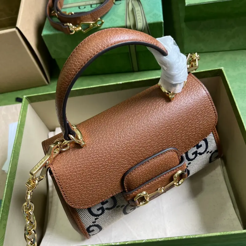 Gbag Horsebit 1955 mini handbag, complete with original green box. This Gbag Horsebit 1955 handbag is crafted from brown leather. Drawing inspiration from archival designs, the collection meticulously blends classic details from the brand’s founding over sixty years ago with contemporary refinement, highlighting the unique allure of the horsebit. This design, inspired by the brand’s equestrian roots, features a double ring and a long bar, and has become one of the brand’s most recognizable signature elements. Made of brown leather with a shiny gold-toned horsebit hardware, the interior features two main compartments and an open pocket, handles (10 cm drop), a 50 cm chain strap, and a 54 cm detachable leather shoulder strap. Weight: approximately 0.9 kg. Model No. 703848. Dimensions: 22 cm (width) x 16 cm (height) x 10.5 cm (depth). Color: Brown/Blue G canvas.