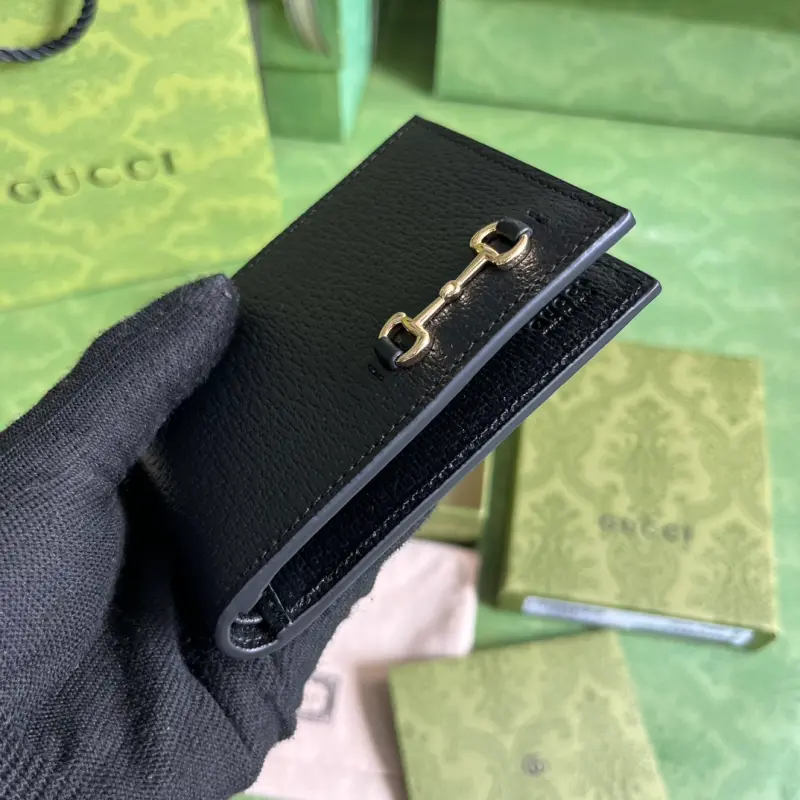This bifold wallet features a horsebit. This black leather wallet features a design inspired by the brand’s equestrian roots, imbued with a touch of luxury. The horsebit, reinterpreted with gold-tone hardware, symbolizes both decades of history and a spirit of continuous innovation. Black leather, gold-tone hardware, and a horsebit lining with a moir?? fabric lining. Interior: 4 card slots, 2 bill compartments. Weight: approximately 0.7 kg. Model No. 708554. Dimensions (closed): 11 cm (width) x 7 cm (height). Dimensions (open): 21 cm (width) x 7 cm (height). Color: Black/original leather.