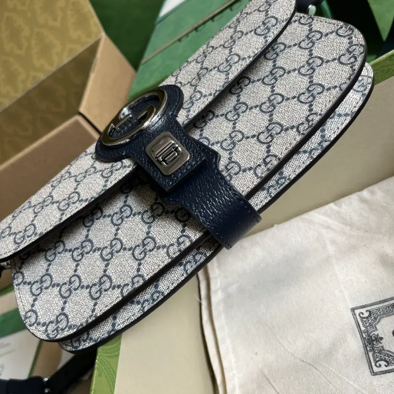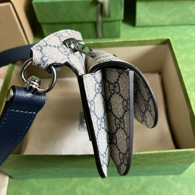 [Comes with full original green box packaging] Gbag Blondie series waist bag, the Gbag Blondie series reinterprets the interlocking double G logo with a geometric shape, which runs through the “Exquisite Gbag” series. The silver-tone buckle injects exquisite retro style into this new beige and ebony GG Supreme canvas waist bag, and the zipper compartment shows a flexible and versatile modern style. Beige and ebony GG Supreme canvas, blue leather details, gold-tone hardware, cotton and linen lining, round interlocking double G, this item can be worn high or low waist, or as a crossbody bag, interior: 2 open compartments, exterior: 1 zipper pocket and 1 card pocket, shoulder strap (42 cm high) twist buckle. Model: 718154. Dimensions: 24 (width) x 4 (height) x 5 cm (depth) Color: blue/pvc. Made in Italy