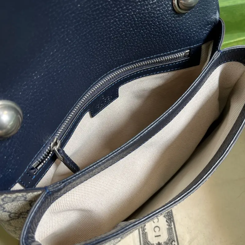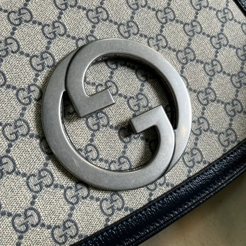 Comes with full original green box packaging. This medium handbag from the Gbag Blondie collection features a geometric interpretation of the Interlocking G logo, presenting a variety of unique pieces. Gold-tone hardware adds a touch of vintage elegance to this piece, showcasing a timeless design that perfectly complements the Hollywood glamour of the runway. This GG Supreme canvas handbag features two interchangeable shoulder straps. Crafted from beige and ebony GG Supreme canvas with blue leather trim, gold-tone hardware, and a cotton and linen lining, it features a round Interlocking G logo. The interior includes two main compartments and a zippered pocket, along with studded handles (12 cm drop), a web bag (52 cm drop), a leather bag (56 cm drop), and a magnetic closure. Model No. 721172. Dimensions: 29 cm (width) x 22 cm (height) x 7 cm (depth). Color: Blue/PVC.