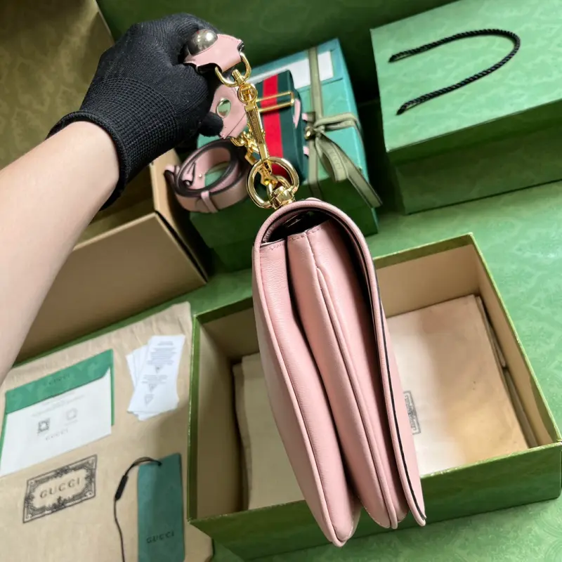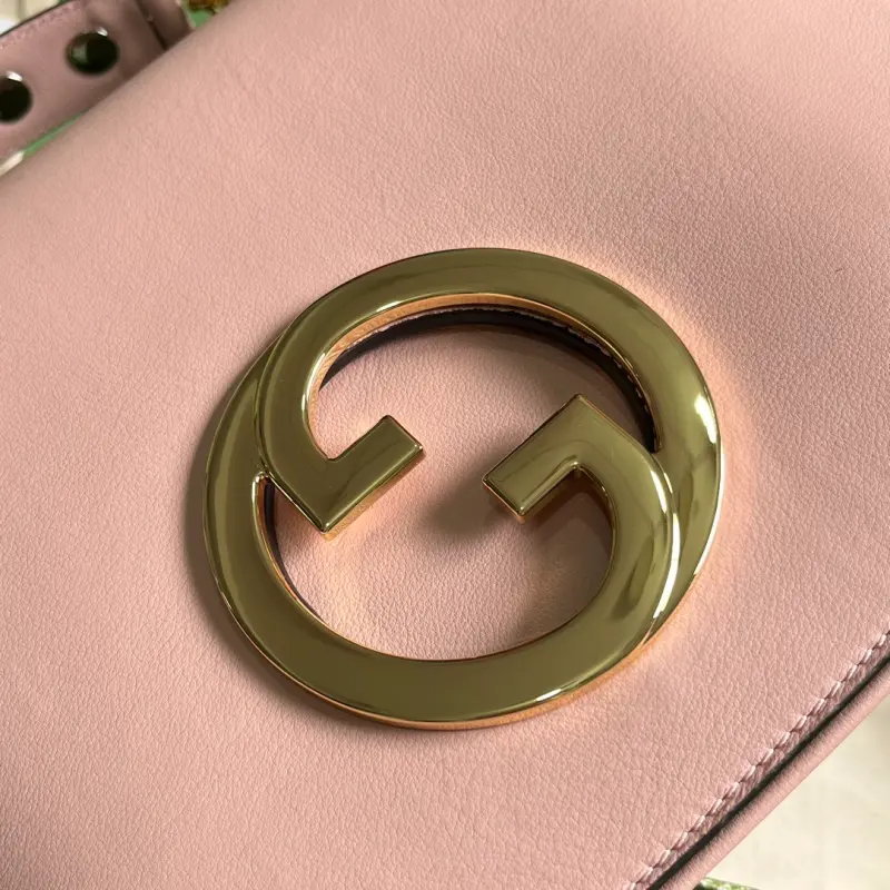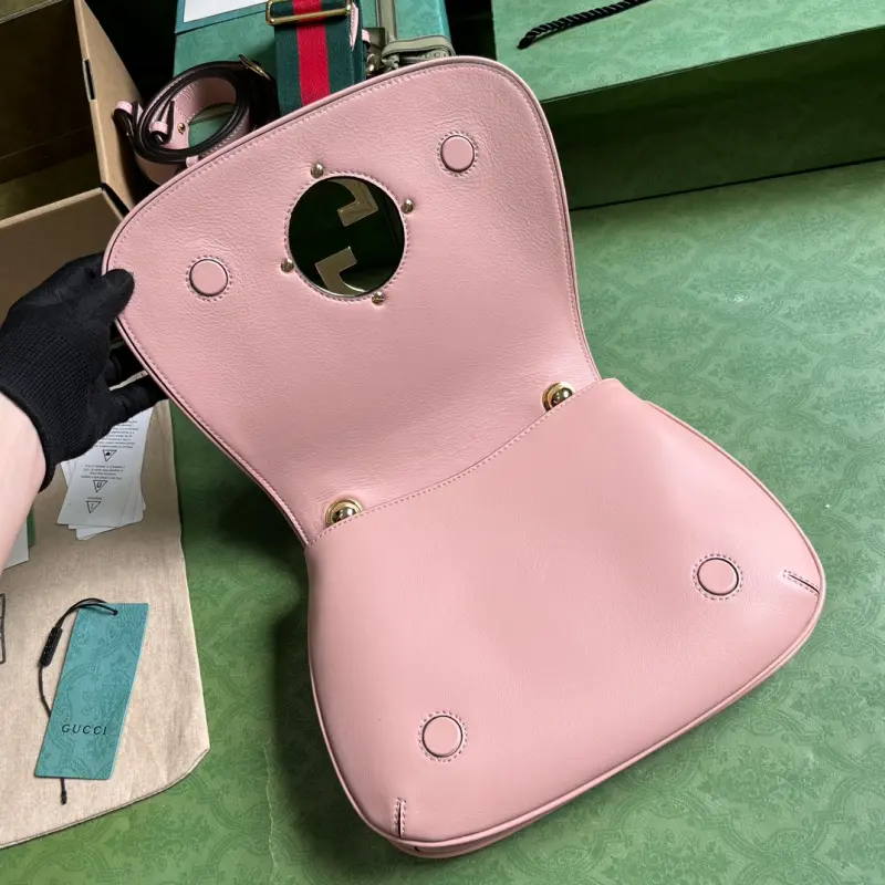 Gbag Blondie small handbag (comes with full original green box packaging). This new collection features a selection of iconic pieces from the house’s archive, reimagining the Interlocking G logo. Gold-tone hardware lends this piece a vintage touch, adding a timeless touch. This pink leather handbag features two interchangeable shoulder straps: one crafted from studded leather and the other from striped web, allowing for a variety of styles and looks. Features pink leather, gold-tone hardware, a red and green web strap, and a round Interlocking G logo. Interior: two main compartments and a zippered pocket, studded handles (12 cm drop), a web pocket (52 cm drop), a leather pocket (56 cm drop), and a magnetic closure. Model No. 721172. Dimensions: 29 cm (width) x 22 cm (height) x 7 cm (depth). Color: Pink/Original Leather.