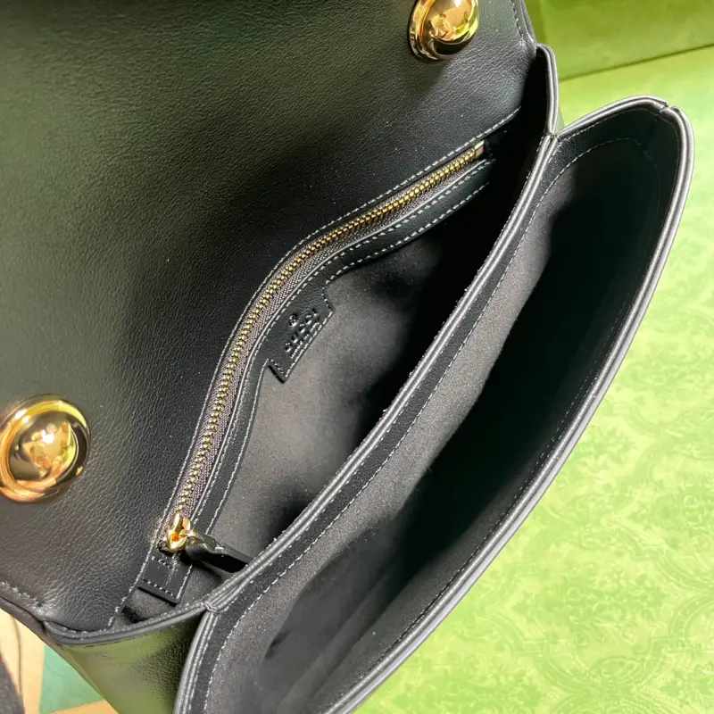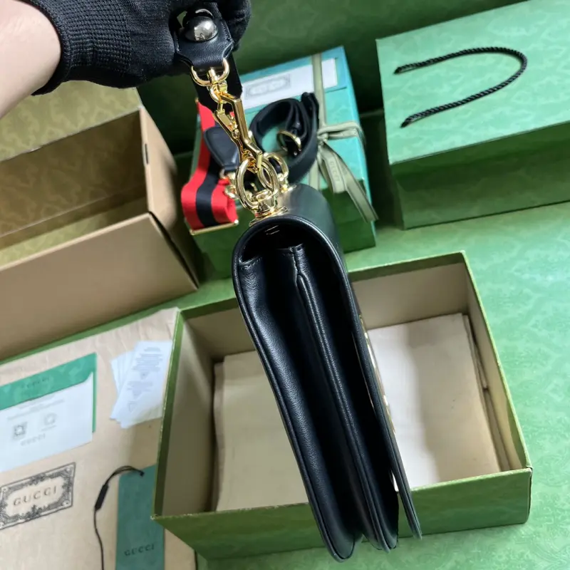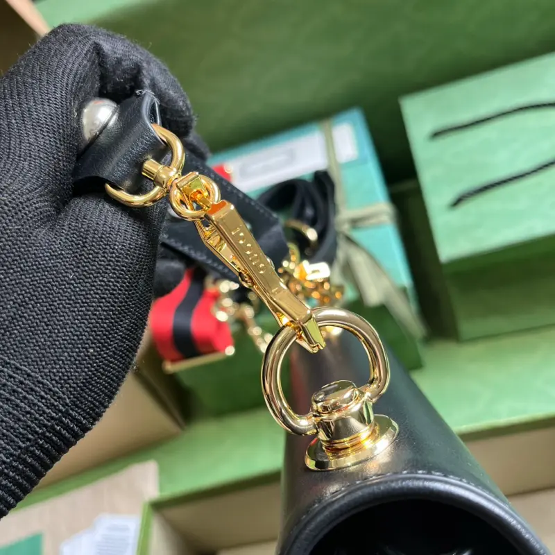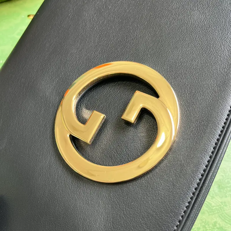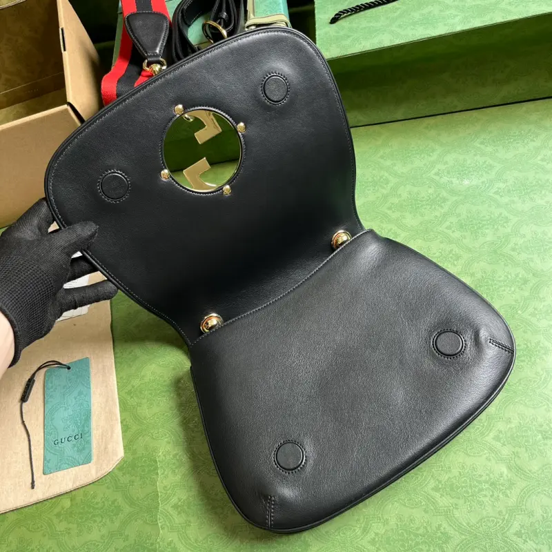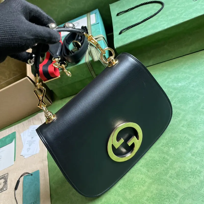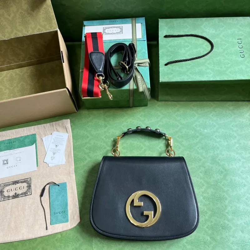 Gbag Blondie small handbag (comes with full original green box packaging). This new collection features a selection of iconic pieces from the house’s archive, reinterpreting the Interlocking G logo. Gold-tone hardware lends this piece a vintage touch, adding a timeless touch. This black leather handbag features two interchangeable shoulder straps: one crafted from studded leather and the other from striped web, allowing for a variety of styles and looks. Black leather, gold-tone hardware, a red and blue web strap, and a round Interlocking G logo. Interior: two main compartments and a zippered pocket, studded handles (12 cm drop), a web pocket (52 cm drop), a leather pocket (56 cm drop), and a magnetic closure. Model No. 721172. Dimensions: 29 cm (width) x 22 cm (height) x 7 cm (depth). Color: Black/Original Leather.