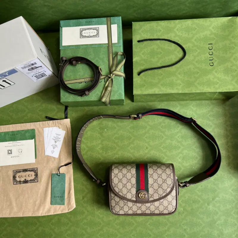 The Ophidia mini GG shoulder bag, featuring a unique new interpretation of the Ophidia collection, is presented in a striking new package. The metal eyelets and rivets evoke a punk vibe, giving this classic silhouette a unique and alluring touch. This mini shoulder bag is crafted from the brand’s signature GG Supreme canvas, creating a playful contrast. The bag features brown GG Supreme canvas with gold-tone hardware, a red and green web strap, and a red and green web lanyard with a Double G. The bag also comes with an additional shoulder strap that can be fastened with a buckle. Interior: One zippered pocket, an adjustable leather shoulder strap with a 45cm drop, and a detachable canvas strap with a 50cm drop. Model No. 722117. Dimensions: 23cm (width) x 17cm (height) x 7cm (depth). Color: Brown/PVC.