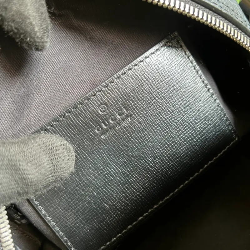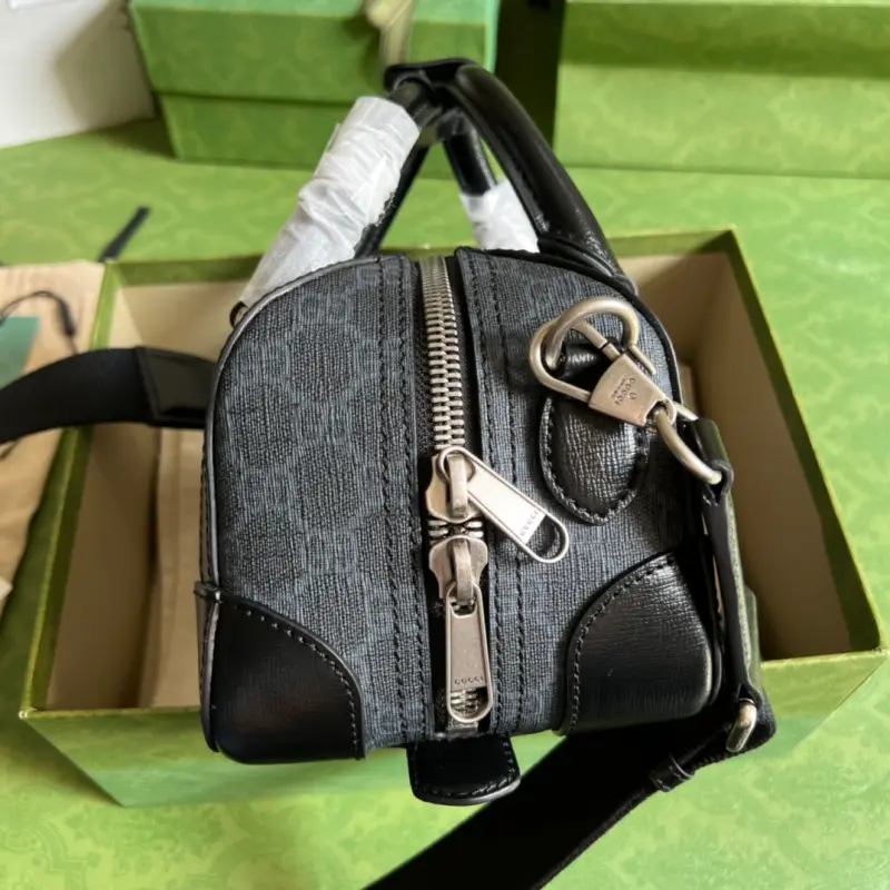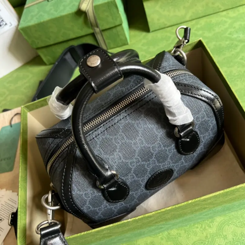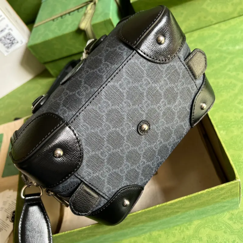 This small travel bag, crafted from elegant brown GG Supreme canvas, echoes the timeless design of the new luggage collection. This canvas, long used across multiple collections, has become a signature of the brand. The Interlocking G leather label is a key feature. Made of brown GG Supreme canvas with brown leather trim, it features an oval Interlocking G leather label, a top handle, a detachable canvas shoulder strap, and a zipper closure. Model No. 723307. Dimensions: 21.5cm (width) x 12.5cm (height) x 13cm (depth). Color: Black/PVC.