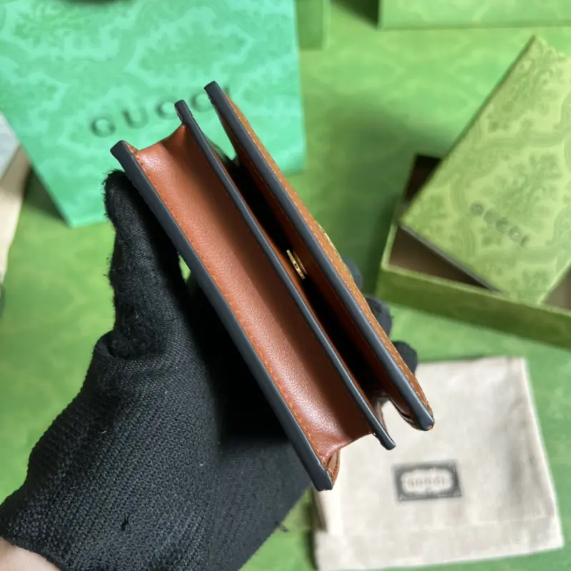 This GG Matelass?? card holder, featuring quilted leather, offers a soft, textured interpretation of the brand’s signature material. A textured geometric pattern vividly reflects this brown card holder and other small leather accessories. A Double G hardware accents the front, adding a touch of brand identity. Details: Brown GG Matelass?? leather. Model No. 723786. Dimensions: 11 x 8.5 x 3 cm. Color: Brown/embossed leather.