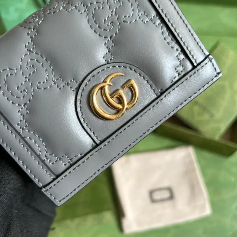 This GG Matelass?? card holder, featuring quilted leather, offers a soft, textured interpretation of the brand’s signature material. A textured geometric pattern vividly reflects this gray card holder and other small leather accessories. A Double G hardware accents the front, adding a touch of brand identity. Details: Gray GG Matelass?? leather. Model No. 723786. Dimensions: 11 x 8.5 x 3 cm. Color: Gray/embossed leather.