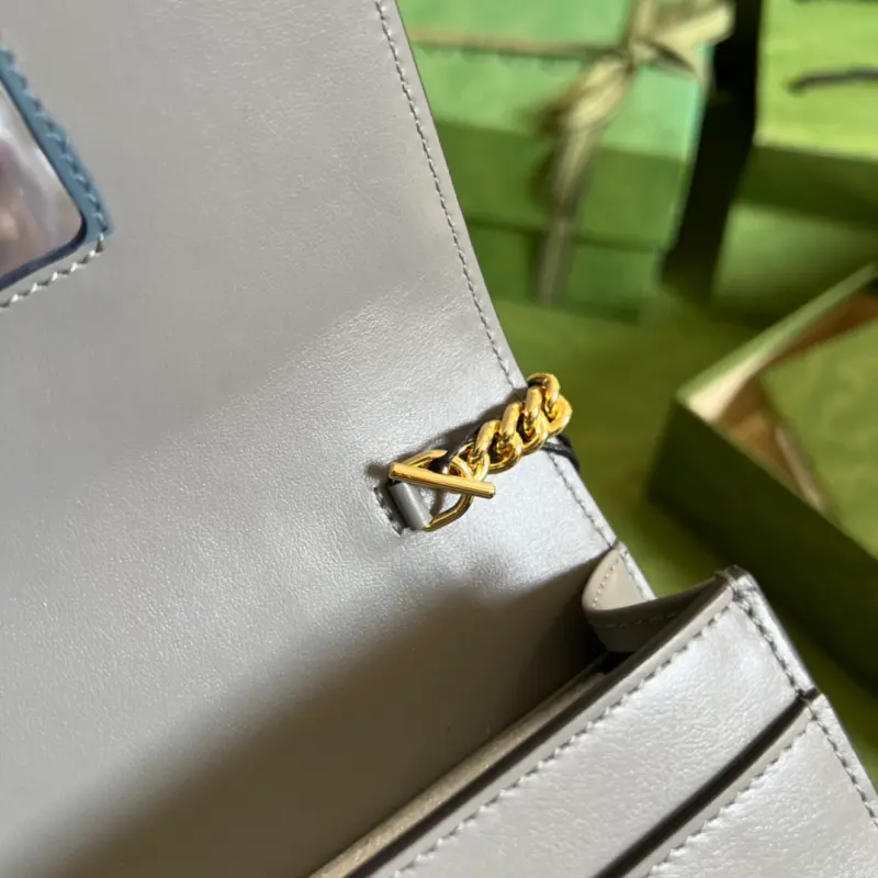 This GG Matelass?? chain bag, featuring quilted leather, offers a soft, textured interpretation of the brand’s signature material. A textured geometric pattern vividly reflects this gray chain bag and other small leather accessories. A Double G hardware accents the front, adding a touch of brand identity. Details: Gray GG Matelass?? leather. Model No. 723787. Dimensions: 20 x 12.5 x 4 cm. Color: Gray/embossed leather.