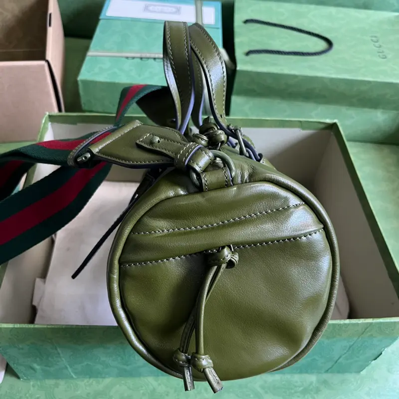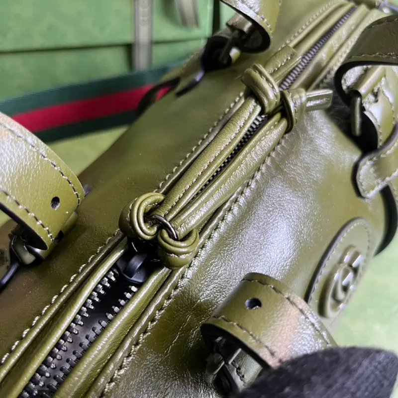 small duffel bag adorned with a tonal Double G motif. A decorative element found on small leather goods in previous collections, this tonal accessory makes its debut in the travel luggage collection, adding a touch of allure. Enamel details add a feminine touch to the iconic Double G motif, creating an understated travel accessory. This green leather duffel adds a touch of elegance to the design. Features green leather, green enamel hardware, red and green web, and a signature GG canvas lining. Interior: one open pocket, adjustable top handle (8cm drop), detachable shoulder strap (56cm drop), and zip closure. Model No. 725701. Dimensions: 28.5cm (width) x 16cm (height) x 16cm (depth). Color: Green/Black G Original Leather.