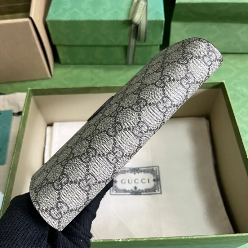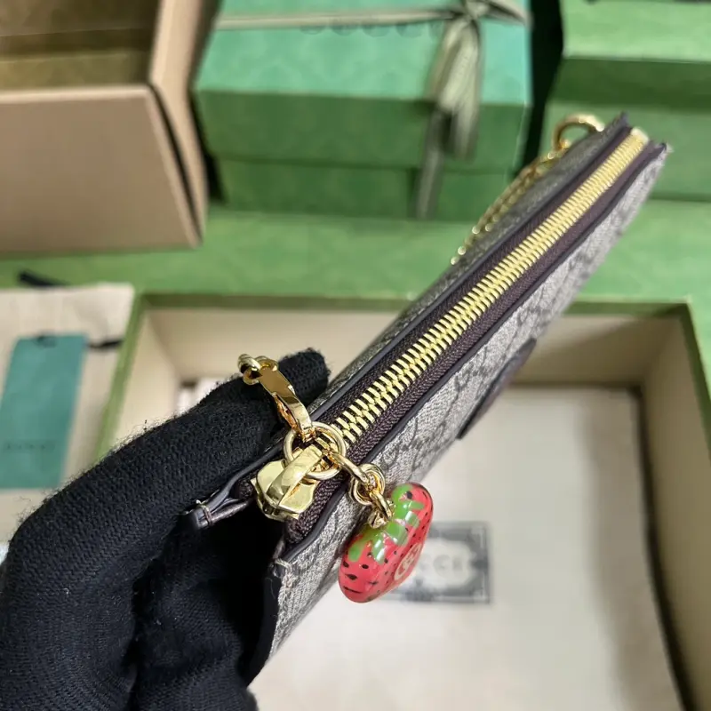 This wristlet features a Double G strawberry design, complete with original green box packaging. The fruit motif embodies the brand’s playful narrative, adding a touch of color to the design. The strawberry is depicted in a variety of forms, often paired with iconic brand design elements. This beige and ebony GG Supreme canvas wristlet is enhanced with resin. It features beige and ebony GG Supreme canvas with brown leather trim, a resin Double G strawberry detail, an interlocking Double G oval leather plaque, four card slots, a zippered pocket, an adjustable handle, and a metal chain wristlet (11 cm high) with a zipper closure. Model No. 726250. Dimensions: 20 cm (width) x 13.5 cm (height) x 2 cm (depth). Color: Brown/PVC.