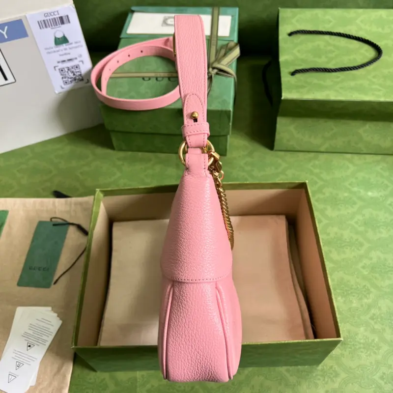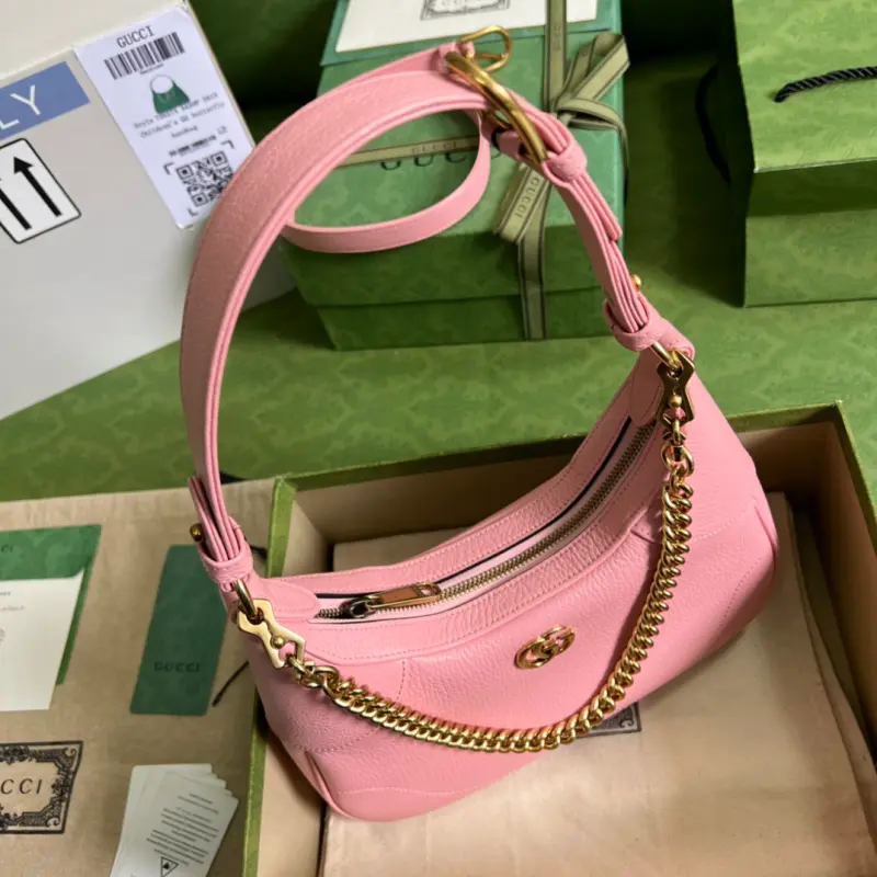 The new GGzp Cosmogonie collection debuted at the historic Castel del Monte in Italy. Aesthetic elements from different eras and geographies intertwined, bridging the past and present. This new small crescent-shaped shoulder bag draws inspiration from the brand’s archives. Crafted from soft leather, it features the Double G logo, which debuted in the 1970s. It comes with two shoulder straps??one in leather and the other featuring the recognizable GG gold-tone metal chain??embodying the brand’s commitment to practical design. Model No. 731817. Dimensions: 25cm (width) x 19cm (height) x 7cm (depth). Color: Pink/Original Leather.