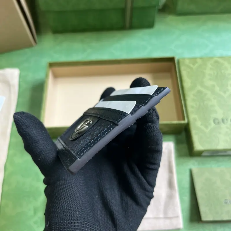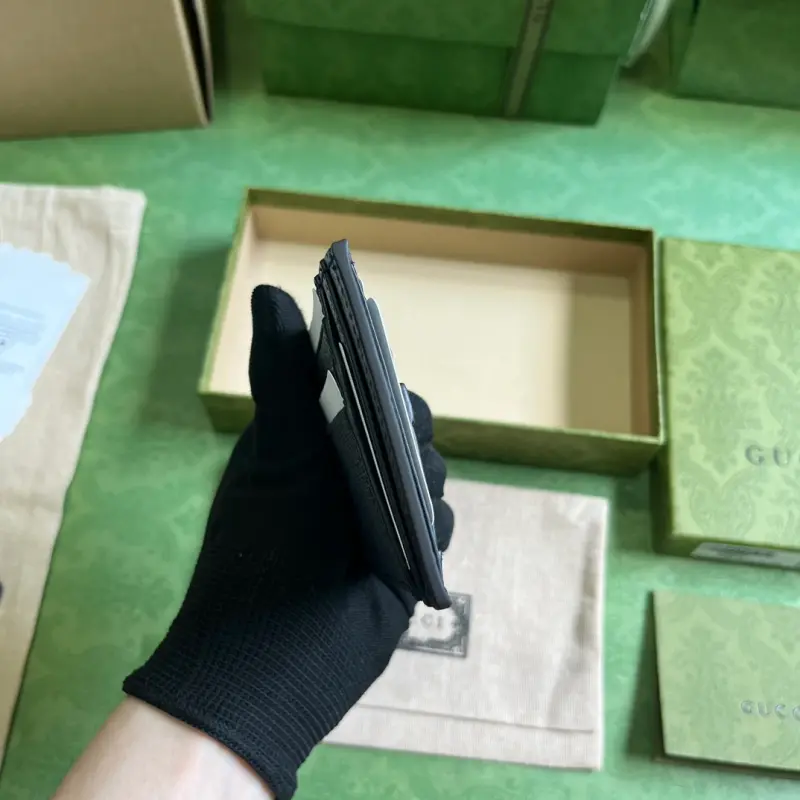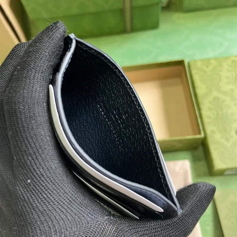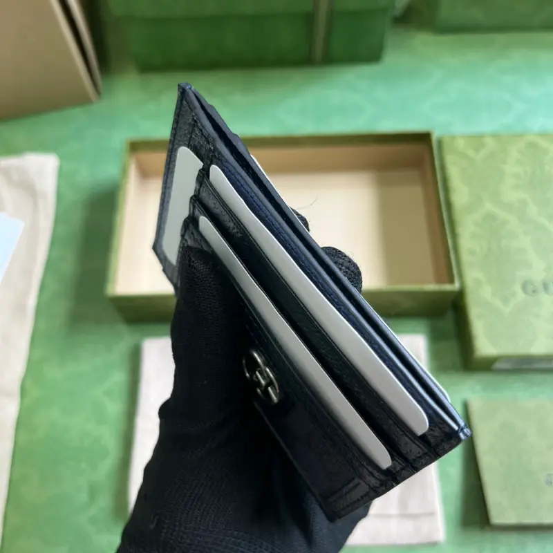 [Includes full original green box packaging] Ophidia series card holder. The GG logo evolved from the Gbag diamond quilting pattern that first appeared in the 1930s and has since become a Gbag tradition. This new Ophidia series card holder features this recognizable pattern in blue and black fabric. Double G hardware adds a touch of glamour to the look. Made of blue and black GG Supreme canvas, with blue leather trim, palladium-tone hardware, and the Double G. Model No. 732018. Dimensions: 11 x 7 cm. Color: Blue/PVC.
