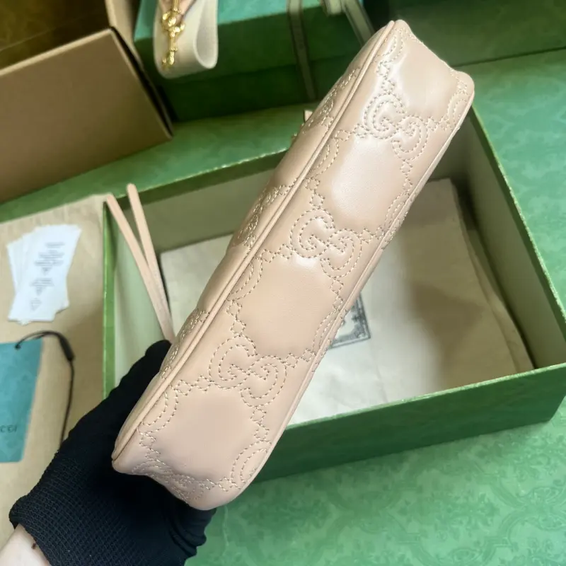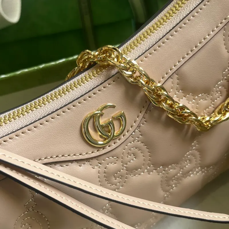 The GG Matelass?? leather handbag, UM8HG 1046, features a soft, textured interpretation of the brand’s signature material. The textured GG motif is vividly featured on a range of bags, including this blush leather bag. A Double G hardware accents the front, adding a touch of brand identity. Made of blush GG Matelass?? leather, with gold-tone hardware, a Double G, and a zipper closure. Two detachable shoulder straps: ivory nylon and gold-tone metal. Model No. 735049. Dimensions: 25cm (width) x 15cm (height) x 8cm (depth). Color: Blush/G-embossed original leather.