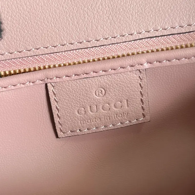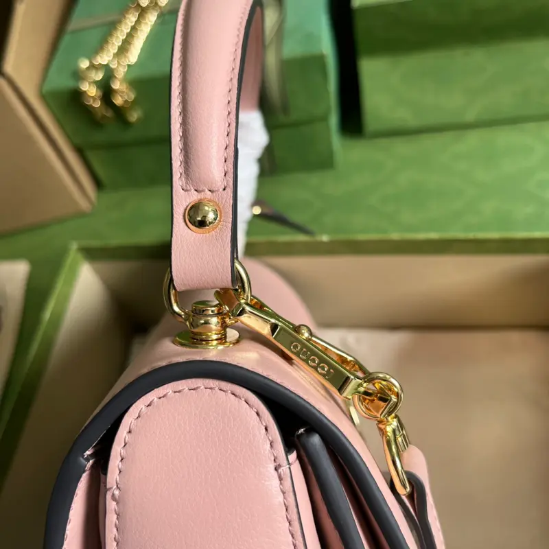 [Includes full original green box packaging] Gbag Blondie handbag, UXX0G 1000, blends vintage elements with archival details. This shoulder bag, expertly crafted from light pink glossy leather and featuring a sophisticated chain strap, exudes a timeless, modern aesthetic. A circular interlocking G, a signature archival design element, adorns the center buckle. Made of light pink leather with gold-tone hardware and featuring a circular interlocking G, this bag features one zippered pocket, two open pockets, a top handle, and a chain shoulder strap. An additional leather shoulder strap with a press-lock clasp is included. Model No. 735101. Dimensions: 23cm (width) x 15cm (height) x 11cm (depth). Color: Light pink/original leather.