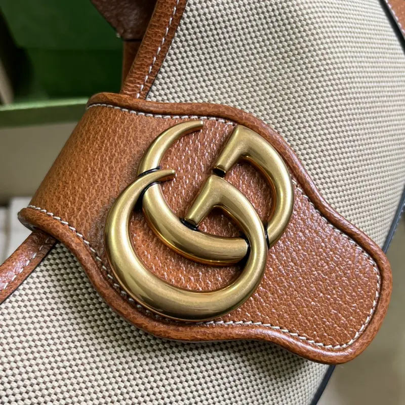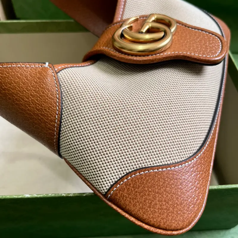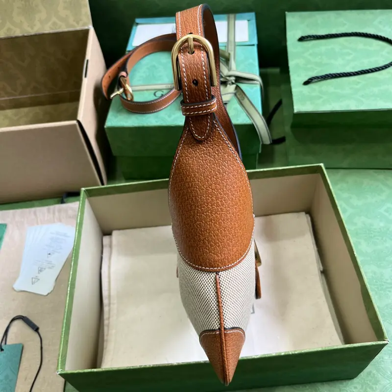 [Includes full original green box packaging] The new GG Aphrodite small crescent-shaped shoulder bag. The “Cosmogonie” collection debuted at the historic Castello di Monte, Italy. The runway showcased aesthetics from different eras and geographies, connecting the past with the present. As a runway piece from the collection, this new crescent-shaped shoulder bag draws inspiration from the brand’s archives, crafted in soft leather and embellished with the Double G logo, first introduced in the 1970s. Model No. 735106. Dimensions: 27 x 13.5 x 2cm. Color: Brown/Canvas.