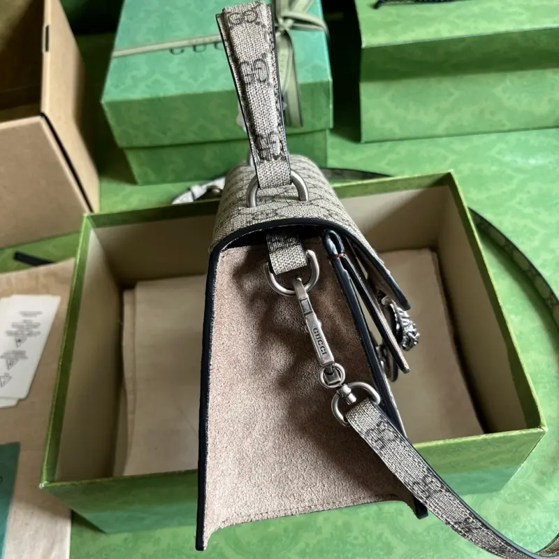The new Dionysus series, complete with original green packaging, draws inspiration from Dionysus, the ancient Greek god of wine. The double tiger-head lock embodies the romantic symbol of love and vows, embodying a unique creative vision. Captivating at first sight. Model: 739496. Dimensions: 24cm bottom width x 16cm height x 11cm depth (20.5cm top width) (23cm height to handle). Color: Khaki/PVC.