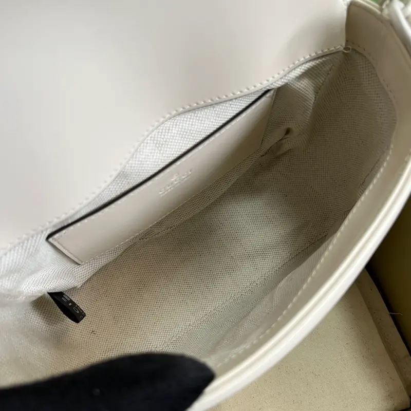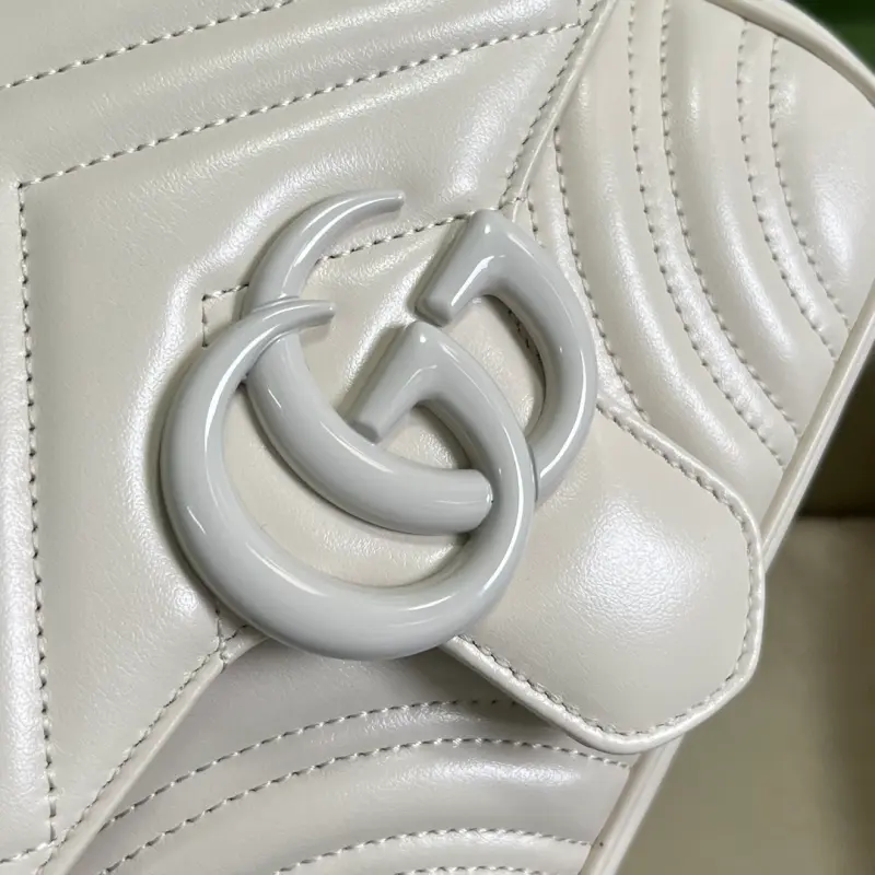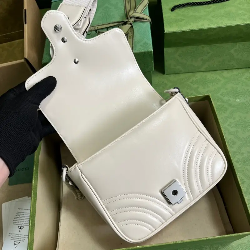 GG Marmont Quilted Shoulder Bag (Includes Full Original Green Box). This GG Marmont shoulder bag is crafted from the instantly recognizable quilted fabric and accented with Double G hardware, vividly showcasing the brand’s heritage. Classic silhouettes are reimagined season after season, embodying Gbag’s modern aesthetic. This structured mini shoulder bag is crafted from white leather and embellished with a tonal buckle and shoulder strap. The textured materials and geometric shapes enhance the design’s allure. It features white quilted V-shaped leather, white brass hardware with a ceramic-effect finish, a cotton and linen lining, and Double G detailing. It comes with two shoulder straps: a chain strap (26 cm long) and a web strap (36 cm long) with a magnetic snap closure. Weight: Approximately 0.576 kg. Model No. 739681. Dimensions: 18 cm (width) x 15 cm (height) x 8 cm (depth). Color: White/White G Original Leather.