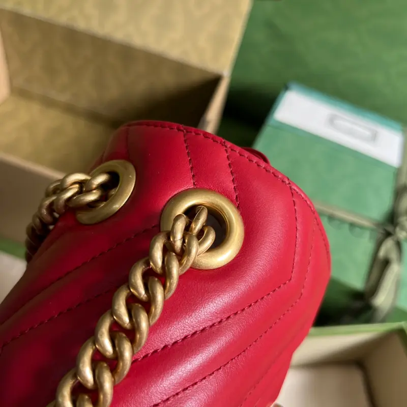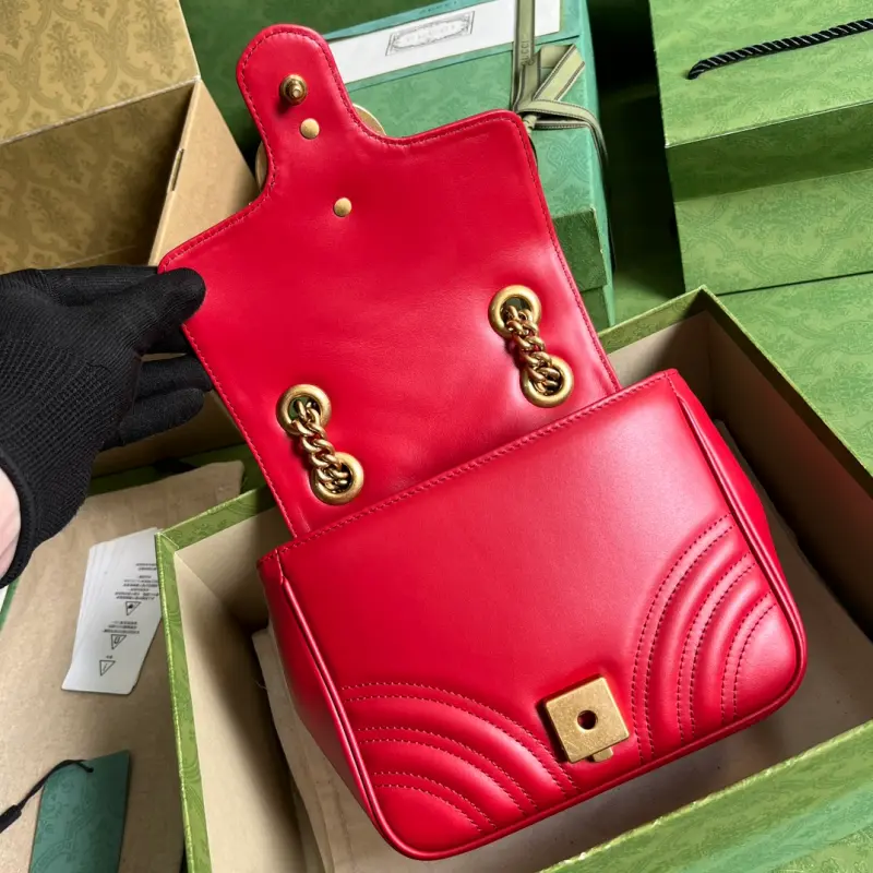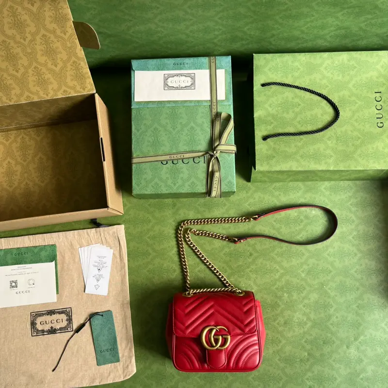 [Comes with full original green box packaging] A brand new upgraded version of the popular Fang Pangzi. With its instantly recognizable quilted fabric and Double G hardware, the GG Marmont handbag series has become a symbol of the brand. This classic series introduces new silhouettes every season, echoing Gbag’s current aesthetic. This shoulder bag is crafted from bright red leather and cleverly incorporates antique gold-tone details. Model: 739682. Dimensions: 18*13.5*8cm. Color: Bright Red/Original Leather