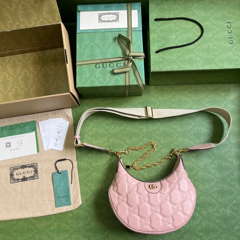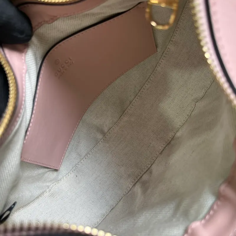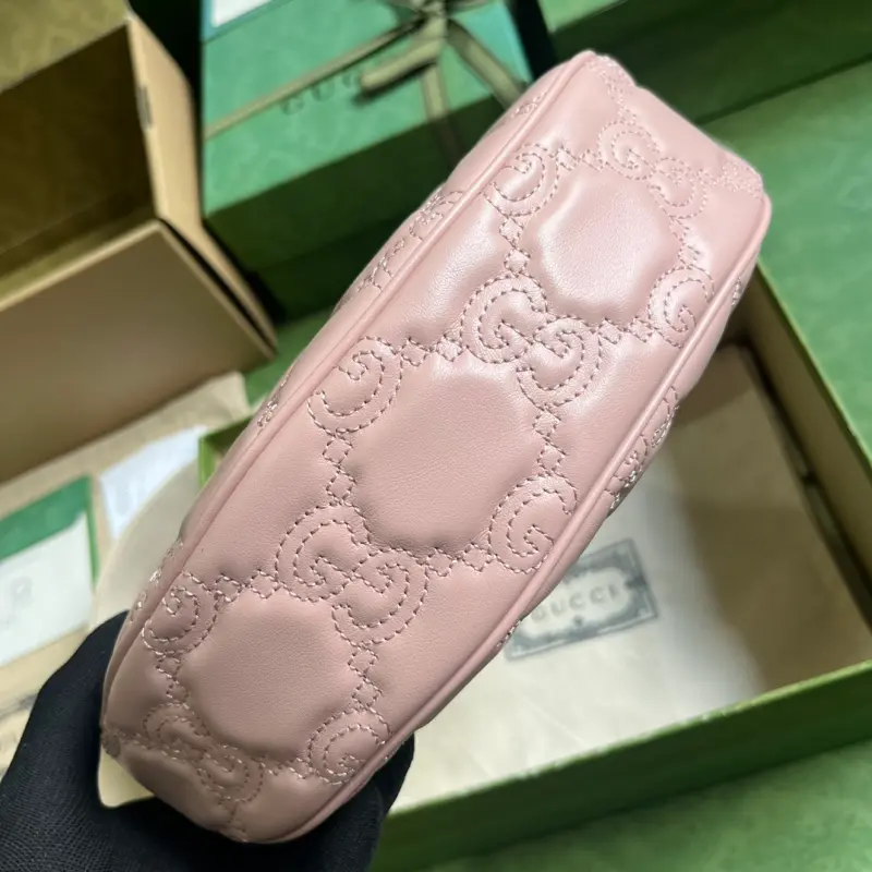 Comes with a complete set of original green box packaging. This small GG Matelass?? shoulder bag features a reimagined, ultra-soft texture in classic Matelass?? leather, showcasing the brand’s recognizable monogram pattern in a fresh perspective. This small shoulder bag features a chic pink leather design, complemented by a contrasting Double G logo. Made of pink GG Matelass?? leather with gold-tone hardware and a canvas-lined Double G logo, the bag features an interior with one open pocket, a chain shoulder strap (33cm drop), an adjustable canvas shoulder strap (66cm drop), and a zipper closure. Model No. 739709. Dimensions: 27cm (width) x 18cm (height) x 7cm (depth). Color: Pink/Original G embossed leather.