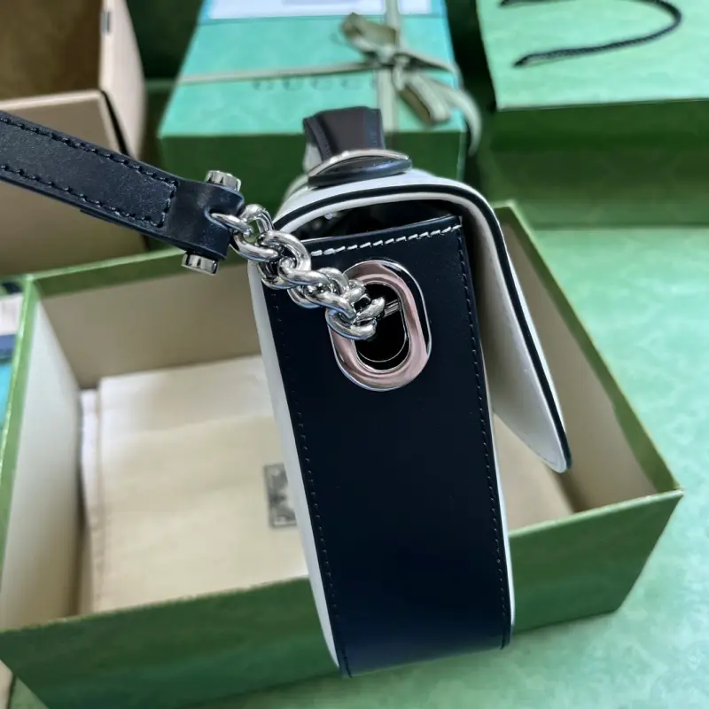 Small GG shoulder bag (comes with full original green box packaging). This mini GG bag is a refined interpretation of the brand’s beloved classic silhouette, ingeniously incorporating the recognizable mini Double G hardware. This small shoulder bag is expertly crafted from black and white leather with palladium-tone hardware. Black and white leather, palladium-tone hardware, and a suede-like microfiber lining with Double G detailing. Interior: one zippered pocket, a single handle with a 2cm drop, an adjustable and detachable leather shoulder strap with a 50cm drop, and a detachable chain shoulder strap with a 24cm drop, featuring a push-lock closure. Model No. 739721. Dimensions: 27cm (width) x 15cm (height) x 5cm (depth). Color: Black and white colorblock/original leather.