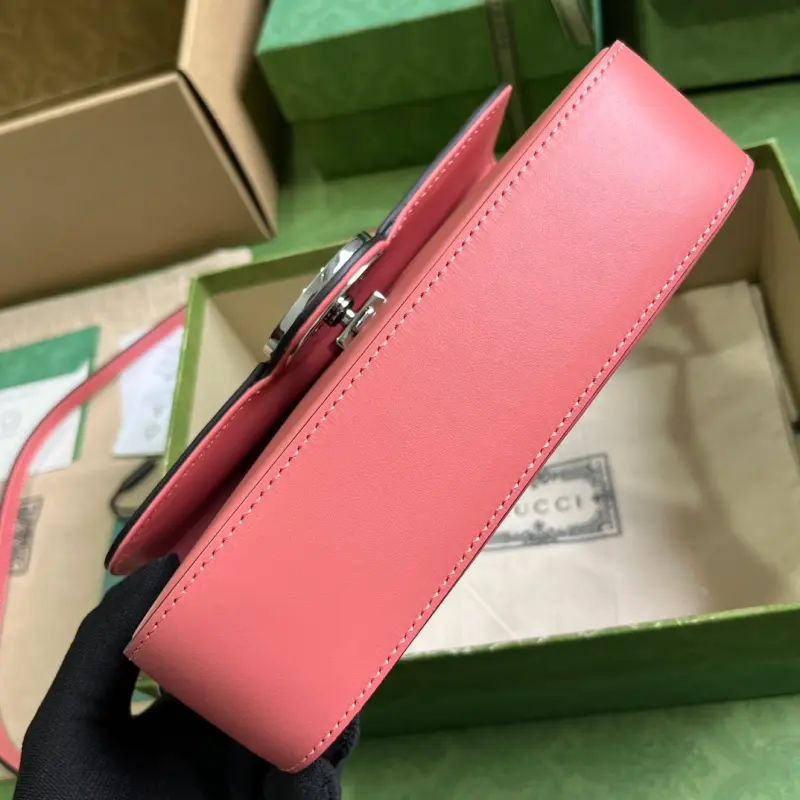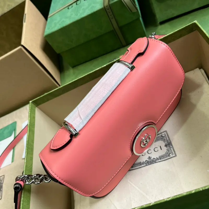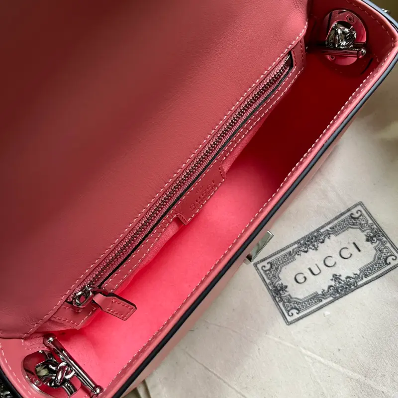 Comes with a complete set of original green box packaging. This Petite GG mini shoulder bag features a soft yet structured shape, a top zip closure, and a subtle Double G motif. The adjustable leather shoulder strap allows it to be worn crossbody. Classic white leather accentuates the collection’s signature monogram. Made of pink leather with palladium-tone hardware featuring the Double G. Interior: one zippered pocket, an adjustable and removable leather shoulder strap (45 cm drop), and a magnetic snap closure. Model No. 739722. Dimensions: 21 cm (width) x 10 cm (height) x 5 cm (depth). Color: Pink/Original Leather.