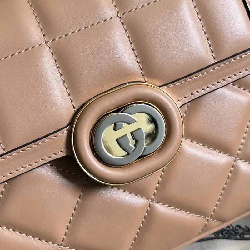 Gbag Deco Mini Shoulder Bag (Includes Original Green Box). This striking shoulder bag explores classic shapes and exquisite fabrics. The quilted design plays with geometric patterns, showcasing iconic symbols from the House’s archives and exuding a vintage vibe. The distinctive Interlocking G hardware contrasts beautifully with the 1970s-inspired tonal leather trim. Made of rose beige quilted leather, it features two-tone vintage Interlocking G hardware, a leather lining, and Interlocking G detailing. The chain shoulder strap adjusts to a 51cm shoulder strap or a 26.5cm top handle. Weight: Approximately 0.7kg. Model No. 741457. Mini dimensions: 18cm (width) x 14.5cm (height) x 8cm (depth). Color: Rose beige/original leather.