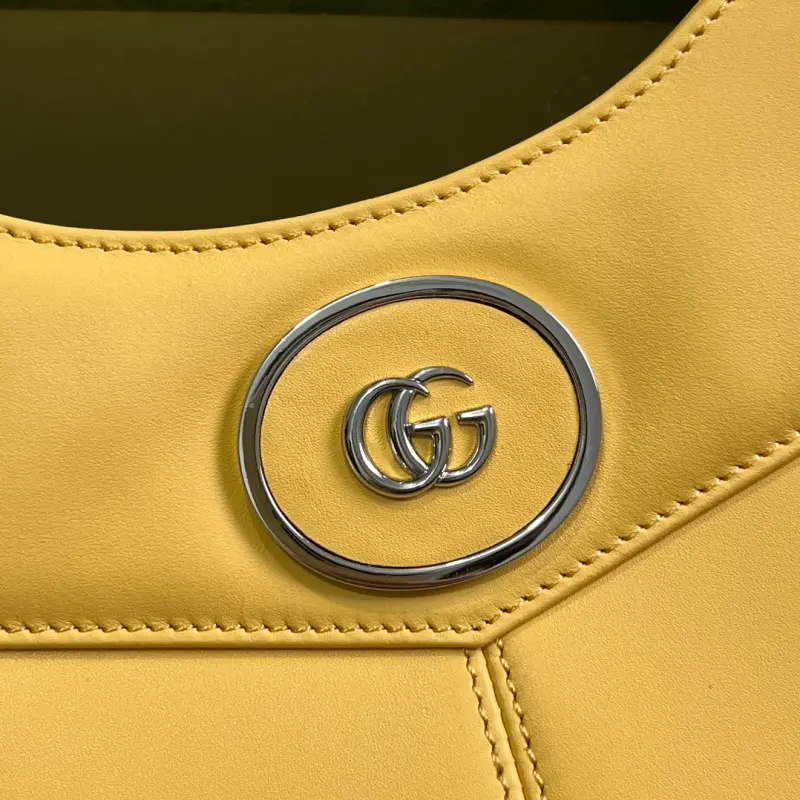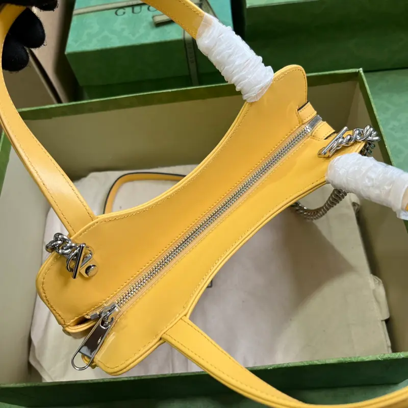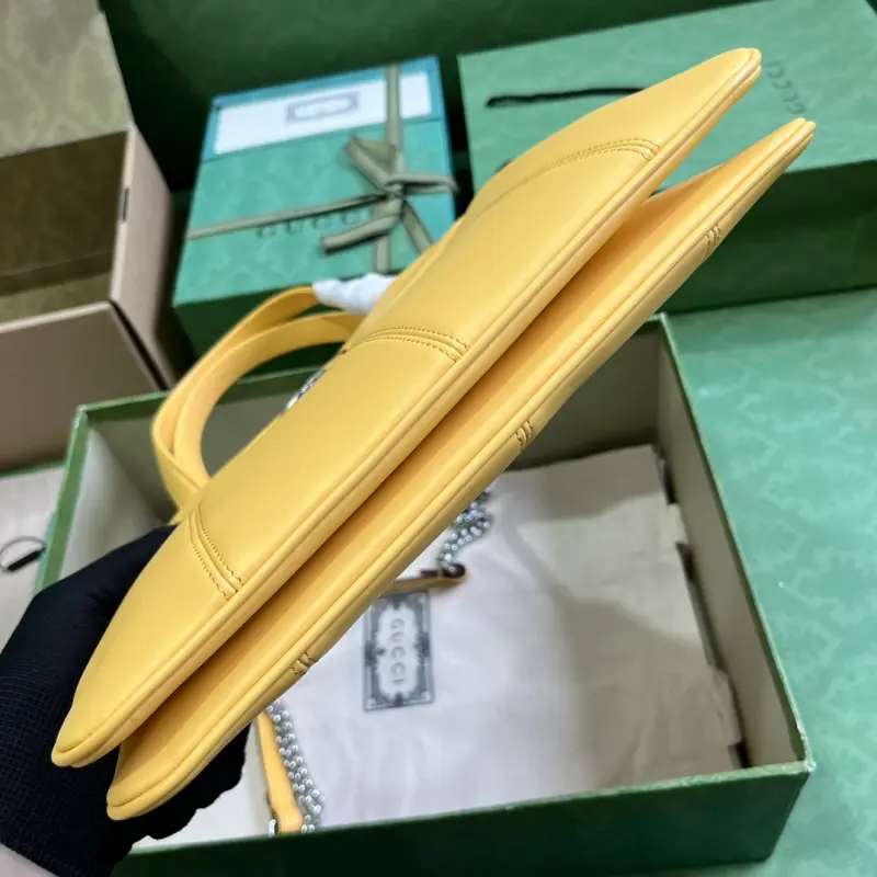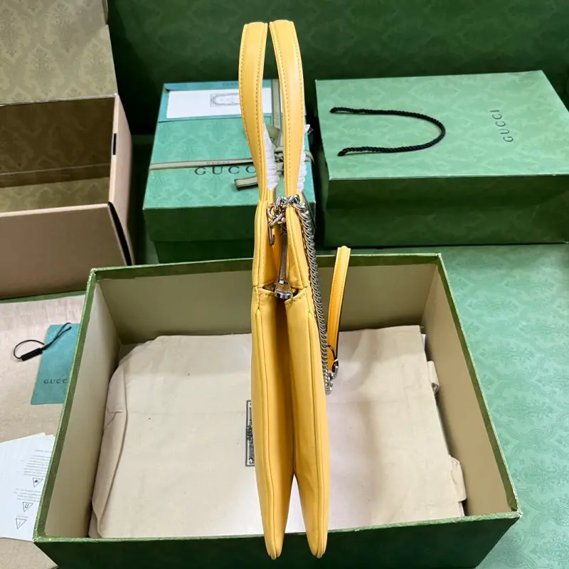 Comes with a complete set of original green box packaging. This mini GG small tote is a vibrant take on a beloved classic silhouette, expertly embellished with the recognizable Double G hardware and a quilted leather finish. This shoulder bag is expertly crafted in green leather with palladium-tone hardware. It features yellow leather, palladium-tone hardware featuring the Double G, an adjustable button-fastening strap, and interior: one zippered pocket, double handles (15.5 cm drop), a detachable shoulder strap (54 cm drop), and a zipper closure. Model No. 745918. Dimensions: 28 cm (width) x 21 cm (height) x 6.5 cm (depth). Color: Yellow/Original Leather.