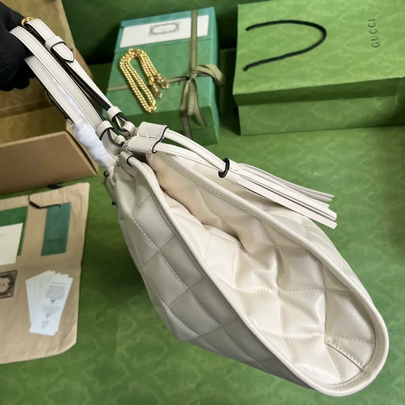 Comes with a complete set of original green box packaging. This updated everyday tote combines traditional elements with innovative design. This new Gbag tote features a relaxed silhouette crafted from quilted fabric and a chain strap for ample storage, making it both stylish and practical. Features off-white quilted leather with off-white leather trim, two-tone vintage Interlocking G hardware, two side tassels, and interior: one zippered pocket, two handles (19 cm drop), and a chain strap (30 cm drop). Weight: Approximately 0.99 kg. Model No. 746210. Dimensions: 43 cm (width) x 28 cm (height) x 8 cm (depth). Color: Off-white/Original Leather.
