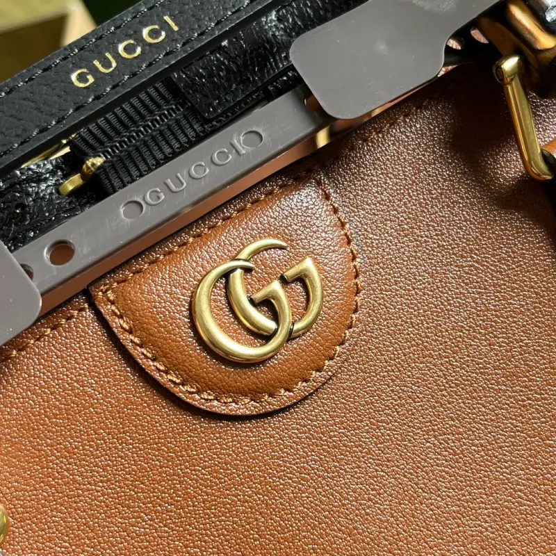 The GG Diana large tote bag, complete with a set of original green gift bags, is a fresh take on the classic bamboo tote from the ’90s. The GG Diana Bamboo Bag reflects the brand’s evolving and revitalized design philosophy, offering a fresh perspective on the classic bamboo tote from the ’90s. This tote features a spacious interior crafted from natural soft leather and features two foldable leather handles, allowing it to be worn as a shoulder bag or a handbag, offering a variety of styling options. Made of natural leather with gold-tone hardware, this piece, as shown, comes with two decorative leather handles with buckles and a microfiber suede lining with the Double G. The interior includes two compartments, a zippered pocket, and two bamboo handles (10.5 cm drop) and two leather handles (30 cm drop). Model No. 746270. Dimensions: 40 cm (width) x 34 cm (height) x 21 cm (depth). Color: Brown/original leather.
