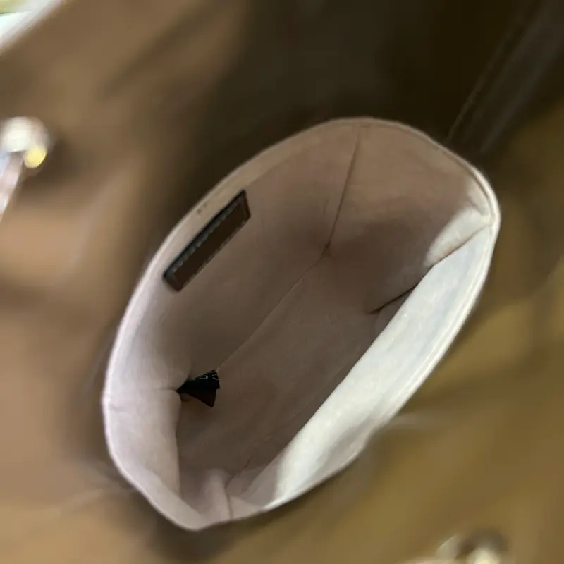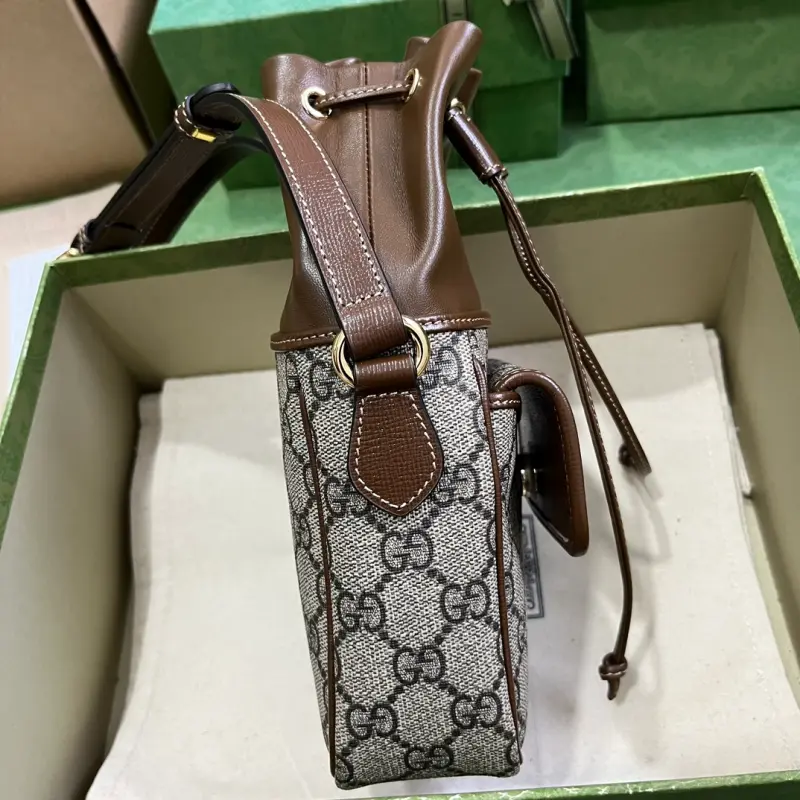 This mini GG bucket bag features the Interlocking GG logo. Gbag traces its roots to the luxury travel traditions of the 1920s and continues to explore its leather goods collections. This beige and ebony GG Supreme mini bucket bag is a masterpiece among small leather accessories, embellished with refined logo details and effortlessly layered over ready-to-wear pieces for a seamless look. Made of beige and ebony GG Supreme canvas with brown leather trim and a suede-like microfiber lining, it features an oval leather Interlocking GG logo plaque, an exterior pocket with a snap button closure, and an adjustable shoulder strap with a drawstring fastening. Model No. 746303. Dimensions: 11.5cm (width) x 20cm (height) x 5.5cm (depth). Color: Brown/PVC.