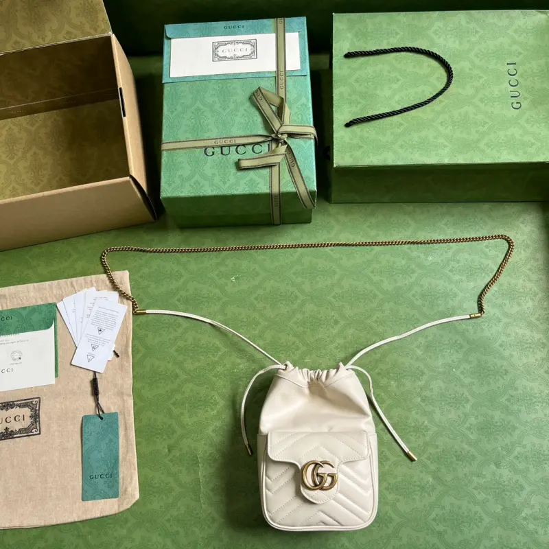 GG Marmont mini bucket bag. This mini bucket bag is expertly crafted from white quilted V-shaped leather. The gold-tone Double G hardware, a signature element of the GG Marmont collection, is a modern interpretation of Gbag’s archival belt buckle from the 1970s. This bucket bag features an exterior pocket and a shoulder strap, creating a dynamic silhouette that allows for versatile wear. It features white quilted V-shaped leather, gold-tone hardware, and a suede-textured moir?? fabric and microfiber blend lining with the Double G. The interior includes three card slots, an exterior pocket, and a shoulder strap (60 cm drop) secured with a drawstring. Weight: Approximately 0.36 kg. Model No. 746433. Dimensions: 14.5 cm (width) x 20 cm (height) x 7.5 cm (depth). Color: White/Original Leather.