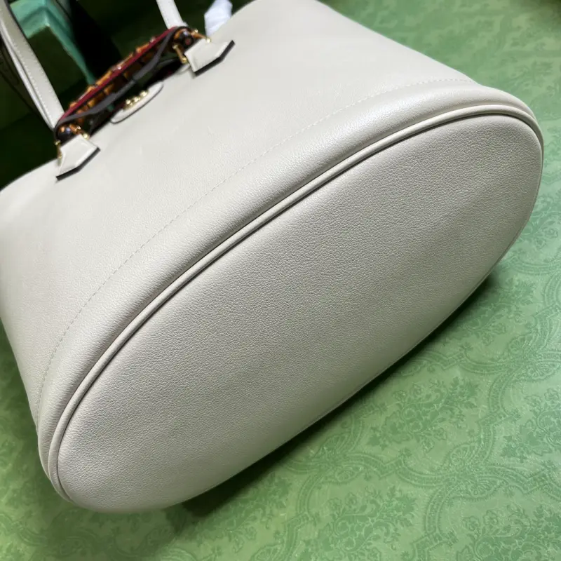 Gbag Diana Bamboo Medium Tote Bag (Includes Full Original Green Box). The Gbag Diana Bamboo Bag reflects the brand’s evolving and revitalized design philosophy, offering a fresh take on the classic bamboo tote from the ’90s. This tote features a spacious interior crafted from natural soft leather and two foldable leather handles, allowing it to be worn as a shoulder bag or a handbag, offering a variety of styling options. Made of natural leather with gold-tone hardware, this bag comes with two decorative leather handles and buckles, as shown in the picture. The bag features a microfiber suede lining with a Double G logo, two main compartments, a zippered pocket, and double bamboo handles (9cm drop) and double leather handles (27cm drop). Model No. 750394. Dimensions: 31cm (width) x 27cm (height) x 15cm (depth). Color: White/original leather.