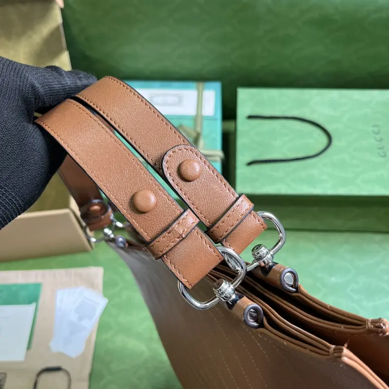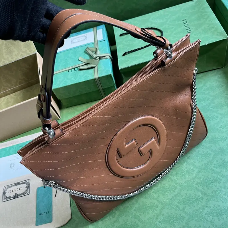 Comes with a complete set of original green box packaging. This Gbag Blondie tote bag is ingeniously embellished with a circular interlocking GG design inspired by a symbolic element from the brand’s archives. This Gbag Blondie tote features a top handle and a chain shoulder strap, and is prominently embellished with the brand’s signature crafted from a leather patch. Made of brown leather with a cotton and linen lining, it features a circular interlocking GG leather patch. The interior includes three main compartments and a zippered pocket, a top handle with a 20cm drop, and a chain shoulder strap with a 42cm drop. Weight: Approximately 1.2 kg. Model No. 751516. Dimensions: 34.5cm (length) x 41cm (width) x 8cm (depth). Color: Brown/Original Leather.