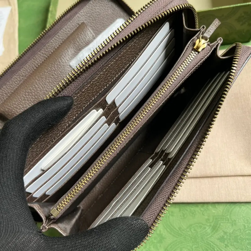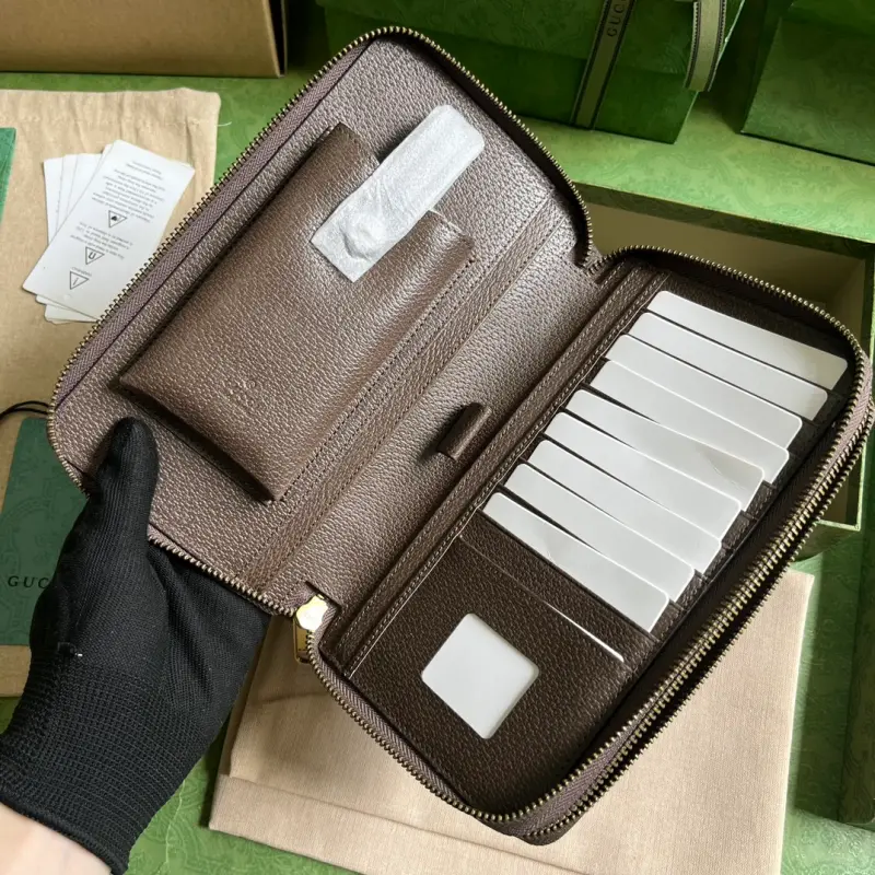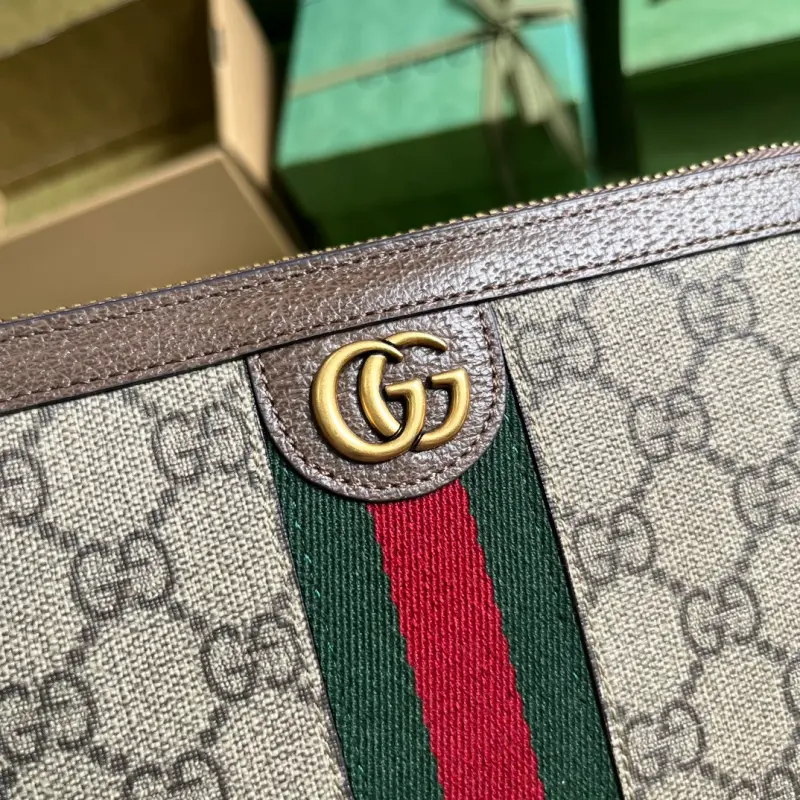 Ophidia GG travel bag (comes with full original green box packaging). Small travel accessories remain an essential part of Gbag’s leather goods collection, paying homage to the brand’s roots in luxury travel. Various logos, inspired by the initials of brand founder Gbago Gbag, imbue each piece with an elegant and timeless signature. This Ophidia travel bag is crafted from classic GG Supreme canvas and features a zippered pocket and iPhone case for a neatly organized interior. It features beige and ebony GG Supreme canvas with brown leather trim, gold-tone hardware, red and green web, and a moir?? fabric lining with a Double G. The interior includes an ID window, multiple card slots, a zippered pocket, a pen slot, and an iPhone case with a zipper closure. Model No. 751610. Dimensions: 21cm (width) x 13cm (height) x 4cm (depth). Color: Brown/PVC.