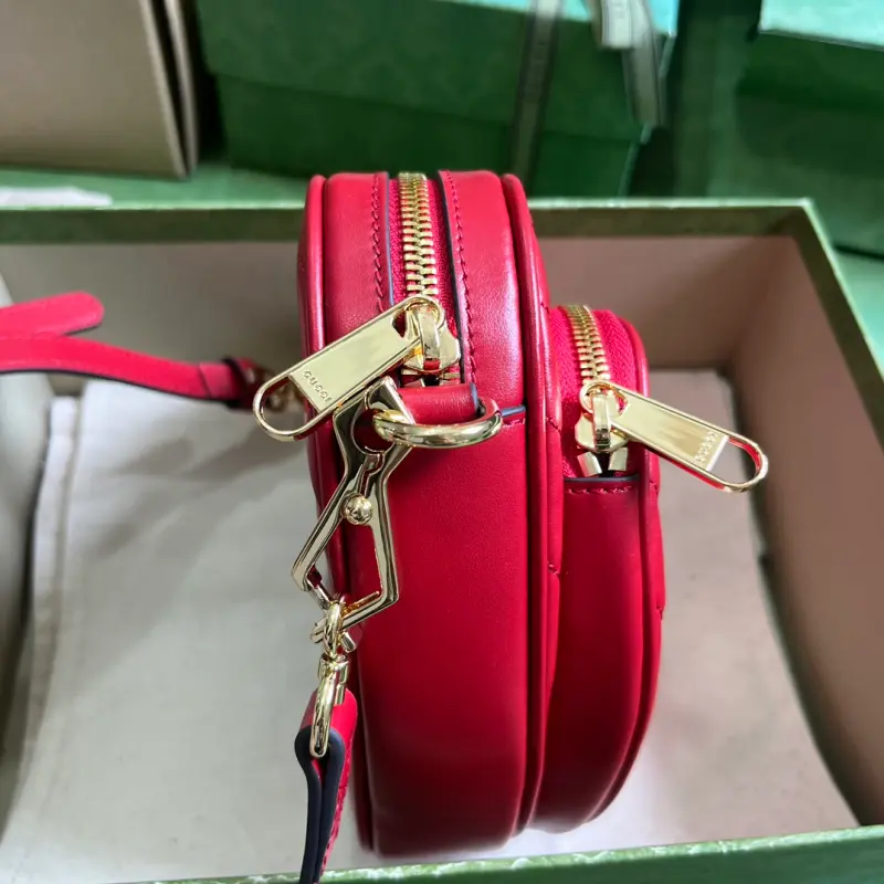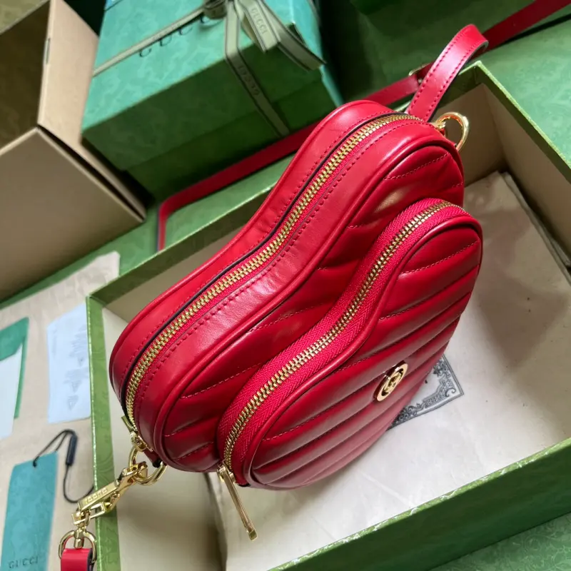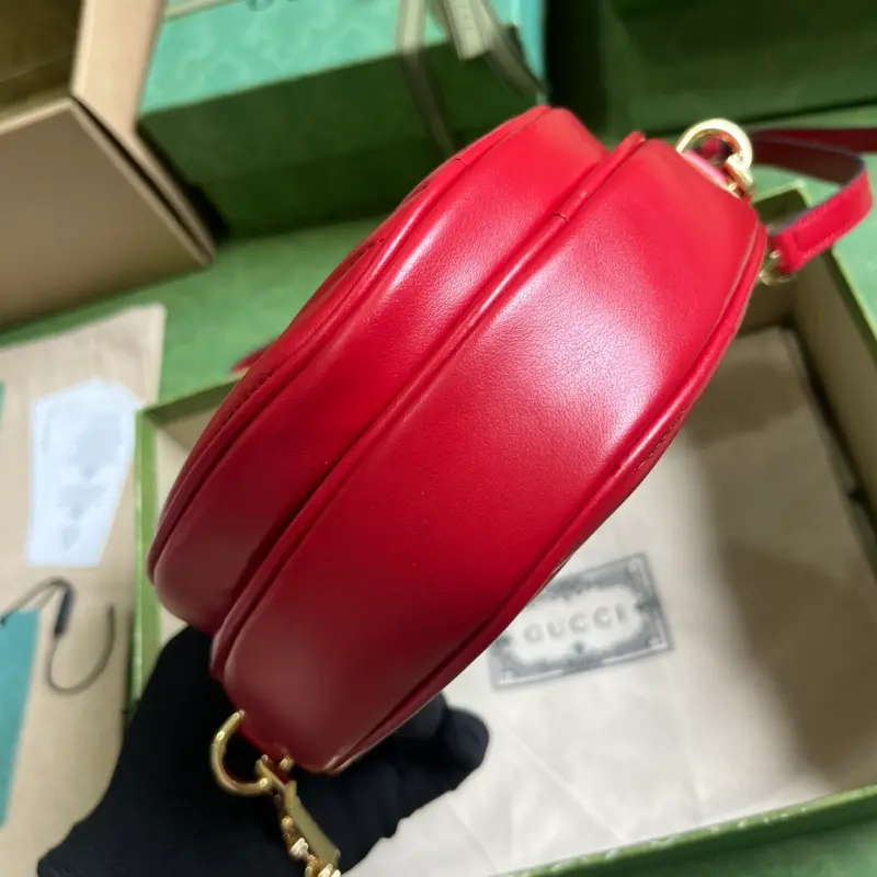 Comes with full original green box packaging. This Interlocking G mini heart shoulder bag features an Interlocking G theme inspired by past and present. Featuring diagonal Marbella leather, the concentric design gives this mini shoulder bag a whimsical twist. Made of red diagonal Marbella leather with shiny gold-tone Interlocking G hardware, it features one open interior pocket and one zippered exterior pocket. It also has a detachable 21.7-inch leather strap with a zipper closure. Model No. 751628. Dimensions: 20cm (width) x 17.5cm (height) x 6.5cm (depth). Color: Red/Original Leather.