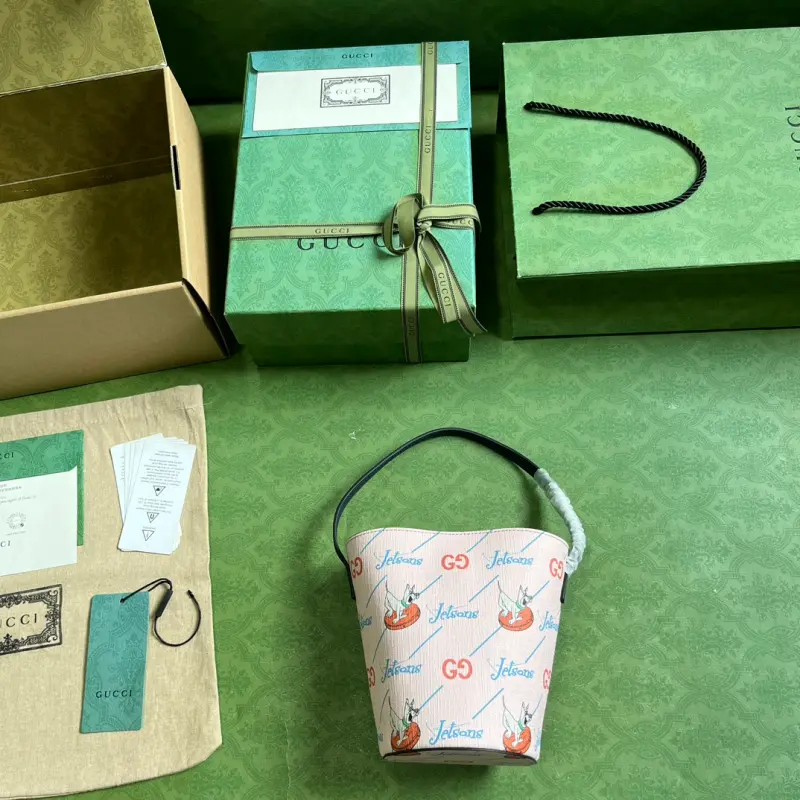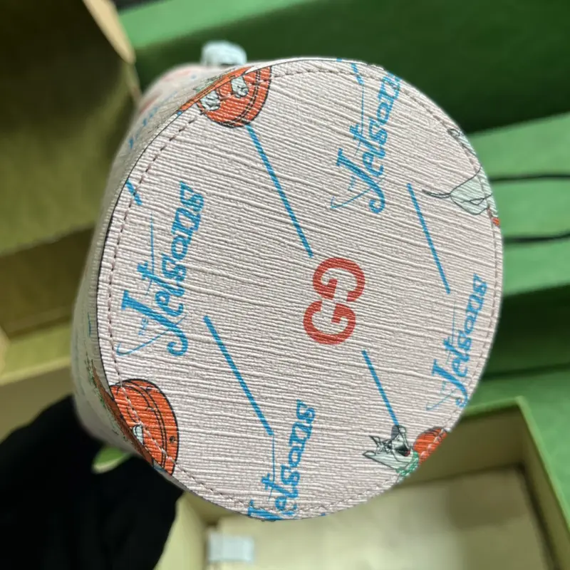 Children’s printed bucket bag (comes with full original green box packaging). Set in the year 2062, “The Jetsons” depicts a futuristic space age filled with magical props and whimsical gadgets, creating a world of technological utopianism. Various garments and accessories feature prints or embroidered details, including animals and robots, playfully blending “The Jetsons” characters with the Gbag logo. Decorated with the GG Jetsons print, the bag is crafted from light pink Supreme canvas with blue Supreme canvas piping. “The Jetsons” and all related characters and elements are the property of & TM HB. (S23), nylon lining, handles with a 13cm drop. Model No. 752356. Dimensions: 18.5cm (W) x 16.5cm (H) x 7.5cm (D). Color: Light pink/Jetsons pattern PVC.