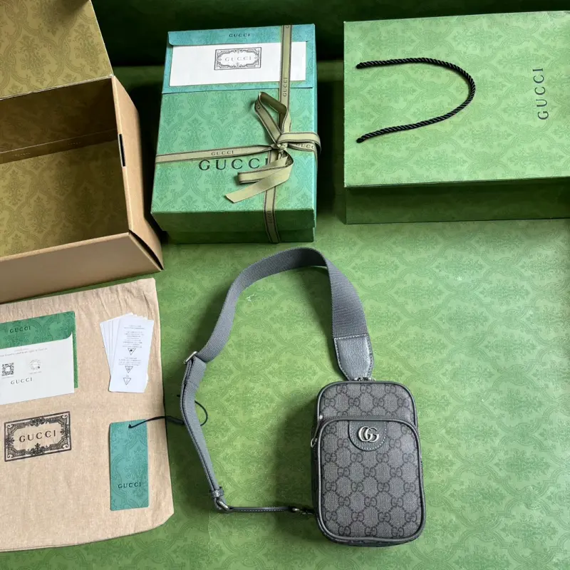 [Includes full original green box packaging] Ophidia GG mini handbag. Small travel accessories remain an essential part of Gbag’s leather goods collection, paying homage to the brand’s roots in luxury travel. Various logos, inspired by the initials of the brand’s founder, Gbago Gbag, imbue the pieces with an elegant and timeless signature. This Ophidia mini handbag is crafted from classic GG Supreme canvas and features two card slots and an exterior zip pocket. It is crafted from beige and ebony GG Supreme canvas with gray leather trim, palladium-tone hardware, a gray web strap, and a cotton and linen lining with a Double G. The interior features two card slots, an exterior zip pocket, and a shoulder strap with a 52cm drop and zip closure. Weight: Approximately 0.45 kg. Model No. 752565. Dimensions: 12cm (width) x 18cm (height) x 6.9cm (depth). Color: Gray/PVC.