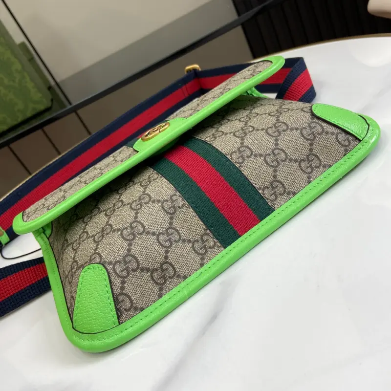 [Comes with a full set of original green box packaging] [New product] Ophidia series GG small waist bag. Fluorescent green embodies the contemporary aesthetic concept of the creative director, vividly interpreting the Ophidia series in a bright pop style. This small waist bag cleverly combines GG patterns and striped ribbon elements, and matches modern colors to show the urban style of classic travel items. Beige and ebony GG Supreme canvas, green leather piping, gold-tone hardware, red and green ribbon, red and blue ribbon belt, cotton and linen blend lining, double G, adjustable waist strap 52 cm high, 80.9 cm long, flap and magnetic snap closure. Model: 752597. Dimensions: 24 (width) x 17 (height) x 3.5 cm (depth) Color: fluorescent green/pvc. Made in Italy