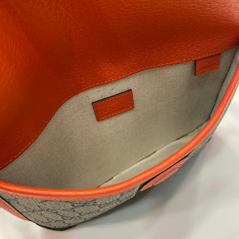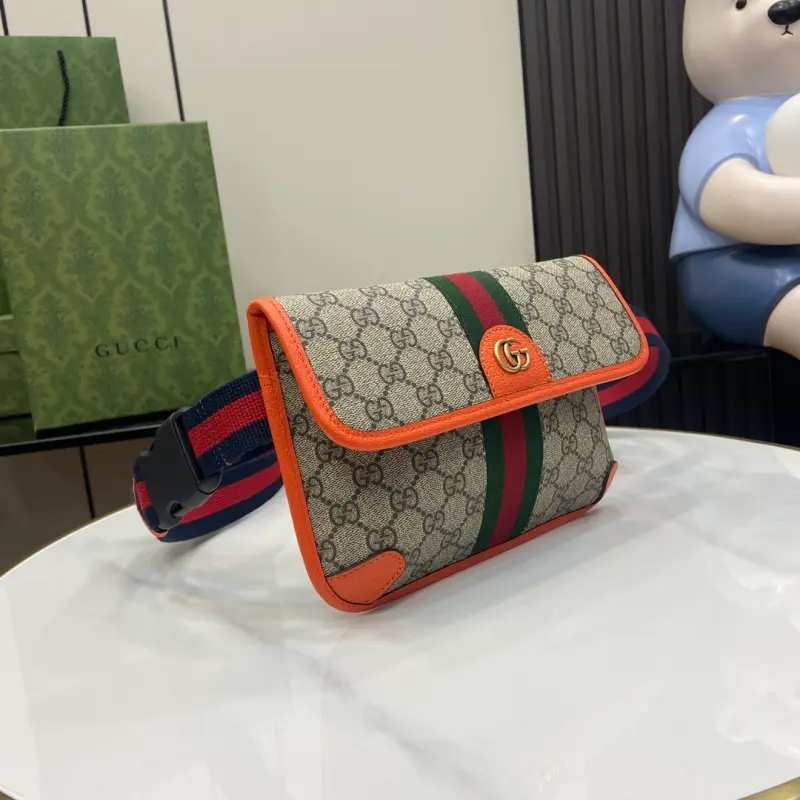 [Comes with a full set of original green box packaging] [New product] Ophidia series GG small waist bag. Fluorescent green embodies the contemporary aesthetic concept of the creative director, vividly interpreting the Ophidia series in a bright pop style. This small waist bag cleverly combines GG patterns and striped ribbon elements, and matches modern tones to show the urban style of classic travel items. Beige and ebony GG Supreme canvas, green leather piping, gold-tone hardware, red and green ribbon, red and blue ribbon belt, cotton and linen blend lining, double G, adjustable waist strap 52 cm high, 80.9 cm long, flap and magnetic snap closure. Model: 752597. Dimensions: 24 (width) x 17 (height) x 3.5 cm (depth) Color: fluorescent orange/pvc. Made in Italy