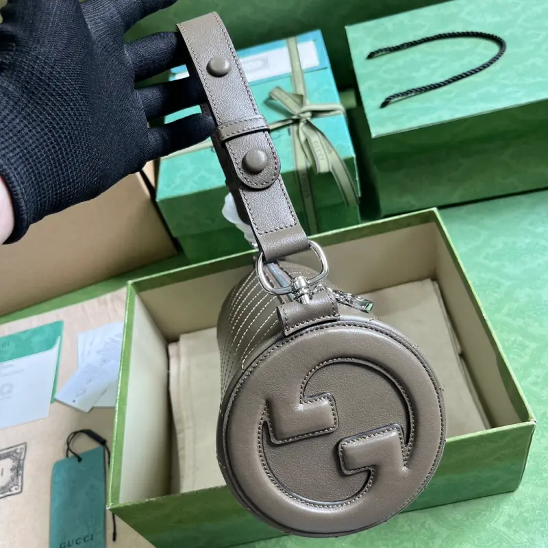 [Includes full original green box packaging] Gbag Blondie small shoulder bag. While featuring one of the brand’s boldest and most modern patterns, the Gbag Blondie collection maintains a subtle, understated aesthetic with its tonal leather designs. The collection ingeniously incorporates the circular, geometric Interlocking GG motif, embodying the vibrant energy of Gbag. This small gray leather shoulder bag is a prime example. Made of gray leather with a cotton lining, it features a circular Interlocking GG zipper pull, an adjustable shoulder strap (adjustable between 17 and 29 cm), and a zipper closure. Weight: approximately 0.4 kg. Model No. 760169. Dimensions: 13 cm (length) x 25 cm (width) x 12 cm (depth). Color: Gray/original leather.