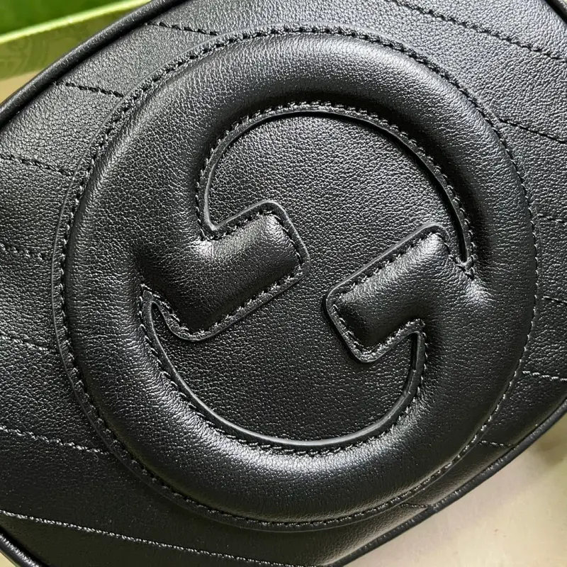 [Includes full original green box packaging] Gbag Blondie mini shoulder bag. While featuring one of the brand’s boldest and most modern patterns, the Gbag Blondie collection maintains a subtle, understated aesthetic with its tonal leather designs. The collection ingeniously incorporates the circular, geometric Interlocking GG motif, showcasing Gbag’s vibrant energy. This black leather mini shoulder bag is a prime example. Made of black leather with a cotton lining, it features a circular Interlocking GG leather patch. Interior: one open pocket, shoulder strap (56cm drop), and zipper closure. Weight: approximately 0.4 kg. Model No. 760175. Mini dimensions: 15cm (length) x 20cm (width) x 8cm (depth). Color: Black/original leather.