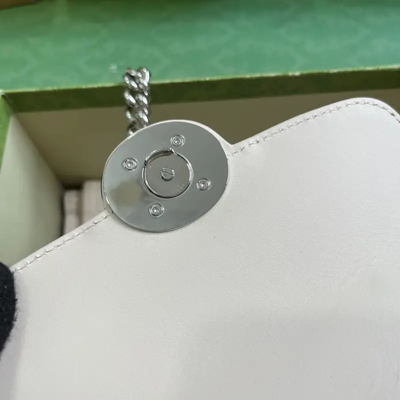 The Petite GG mini handbag, complete with original green box packaging, features the iconic Double G in miniature form across a variety of new leather goods from the Mini GG collection, imbuing the iconic logo with a subtle, understated elegance. The elegant palladium-effect logo blends seamlessly with solid leather and GG Supreme canvas. The brand’s signature adds a touch of class to this white leather mini bag. Features white leather, palladium-tone hardware, a suede-like microfiber lining, a Double G, an interior pocket, a back handle (3cm drop), a detachable chain shoulder strap (30cm drop), and a push-lock closure. Weight: Approximately 0.41 kg. Model No. 760194. Dimensions: 10cm (length) x 18.5cm (width) x 4cm (depth). Color: White/original leather.