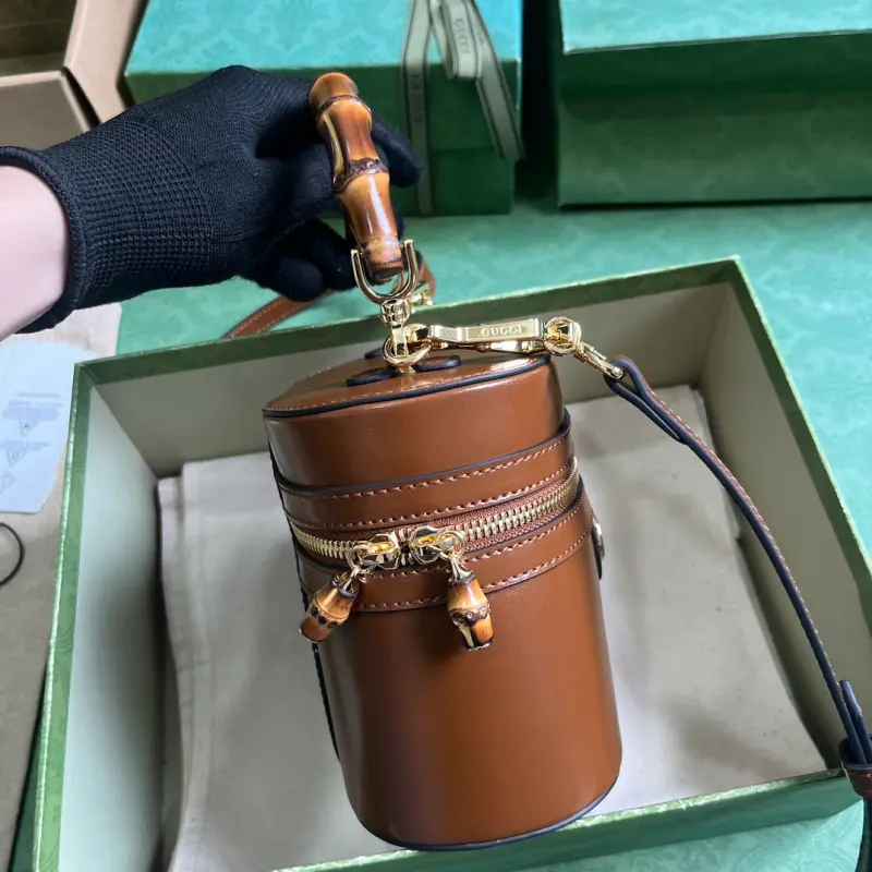 Mini Bamboo Shoulder Bag (Includes Original Green Box). This mini shoulder bag features a bamboo handle and Double G hardware, creatively reinterpreting two iconic brand elements. Crafted from brown leather, it features an adjustable and detachable shoulder strap for a refined finish. Made of brown leather with gold-tone hardware, it features a bamboo handle with Double G, a handle (9cm drop), a detachable and adjustable shoulder strap (50cm drop), and a zipper closure. Model No. 760200. Dimensions: 15.5cm (width) x 13.5cm (height) x 4cm (depth). Color: Brown/Original Leather.