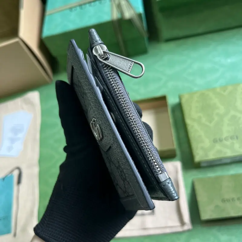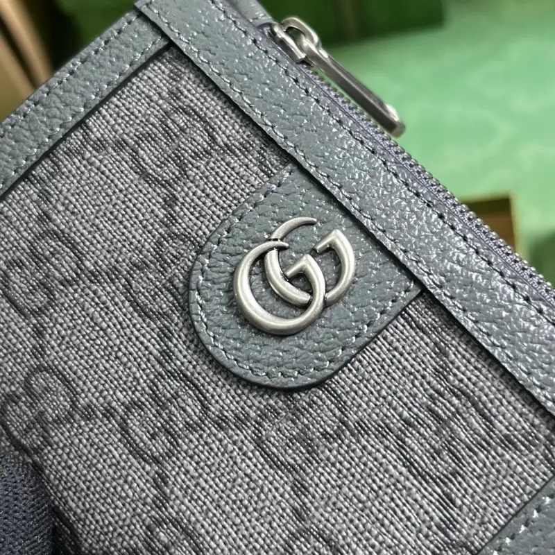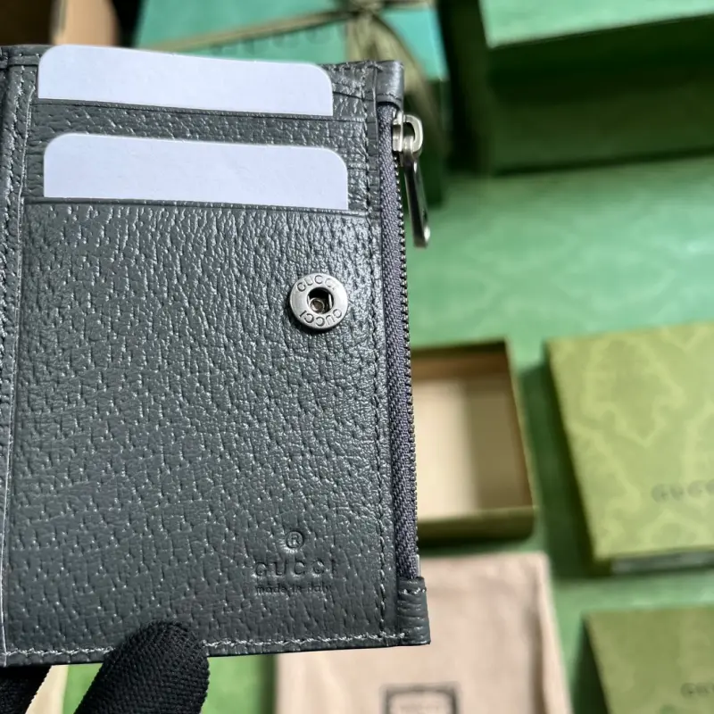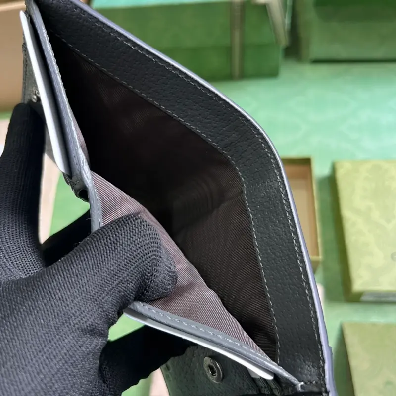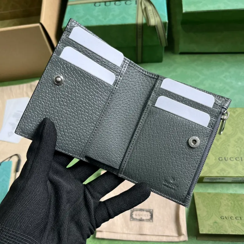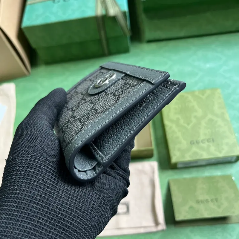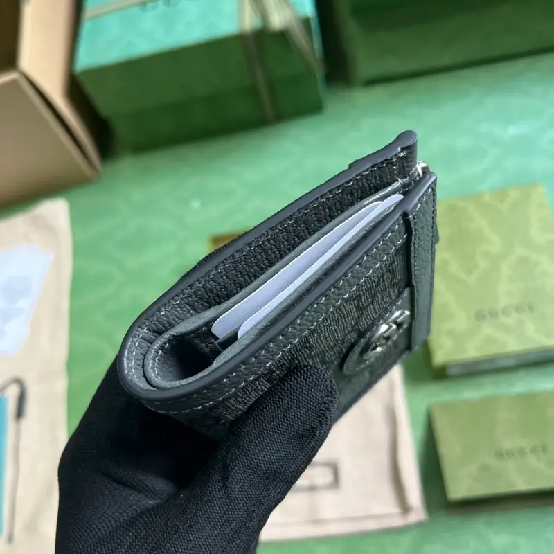 [Includes full original green box packaging] This Ophidia series short wallet features the GG logo, an evolution of the Gbag diamond quilting pattern that first appeared in the 1930s and has since become a Gbag staple. This new Ophidia series card holder features this recognizable pattern in gray and black. Double G hardware adds a touch of glamour to the look. Made of gray and black GG Supreme canvas, with gray leather trim, palladium-tone hardware, and the Double G. Model No. 760238. Dimensions: 8.5*11.5*2cm. Color: Gray/PVC.