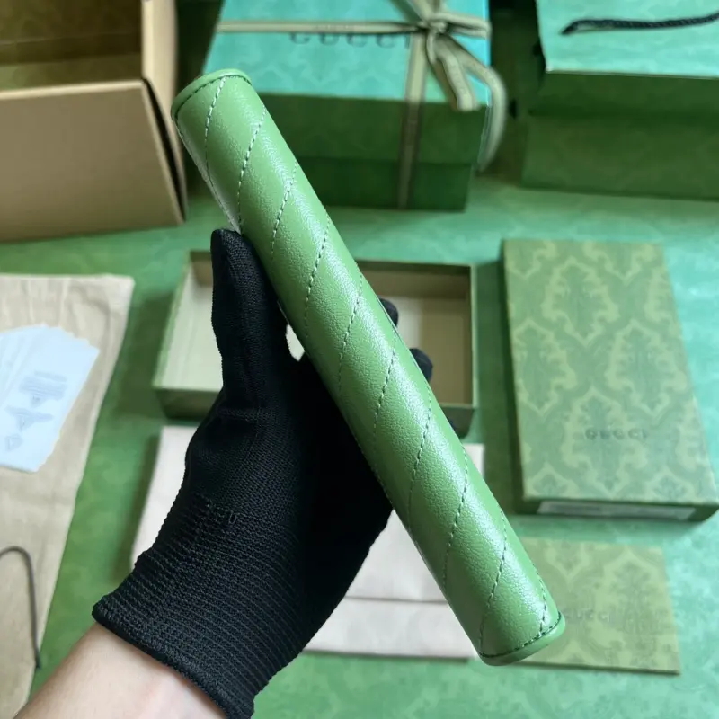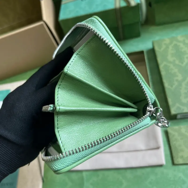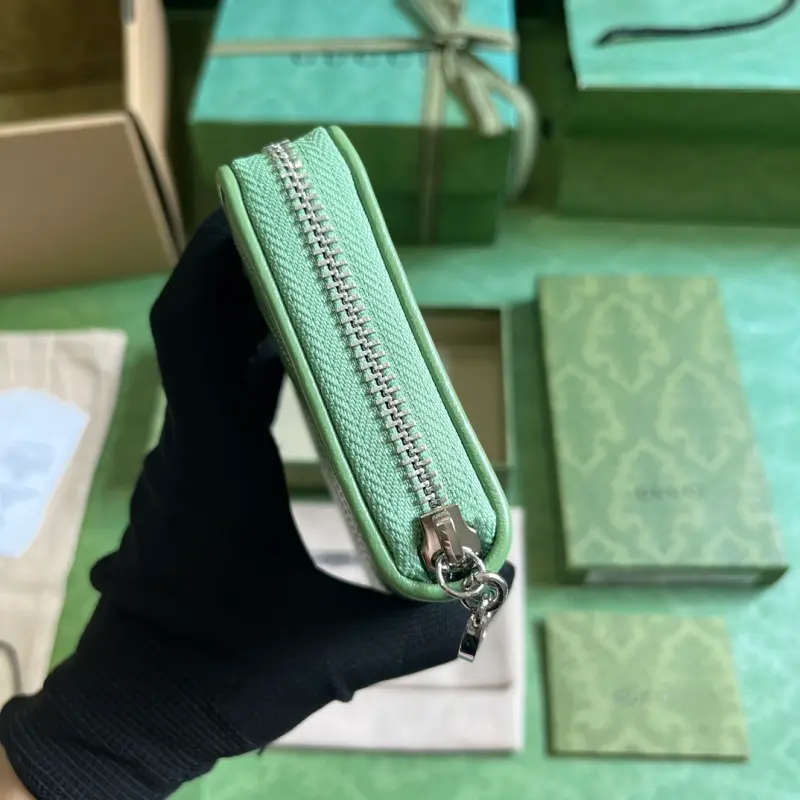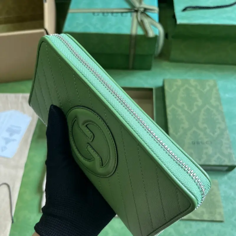 [Includes full original green box packaging] Gbag Blondie zip-around wallet. The Gbag Blondie collection features one of the brand’s boldest patterns paired with tonal leather, exuding a subtle and understated vibe. The collection ingeniously incorporates the circular, geometric Interlocking GG logo, showcasing Gbag’s modern aesthetic. This green leather zip-around wallet features a prominent Interlocking GG detail. It features green leather, a taffeta lining, and a circular Interlocking GG leather patch. The interior includes twelve card slots, three bill compartments, and a zippered coin pocket with zip closure. Weight: Approximately 0.18 kg. Model No. 760312. Dimensions: 11 cm (length) x 19.5 cm (width) x 3 cm (depth). Color: Green/Original Leather.