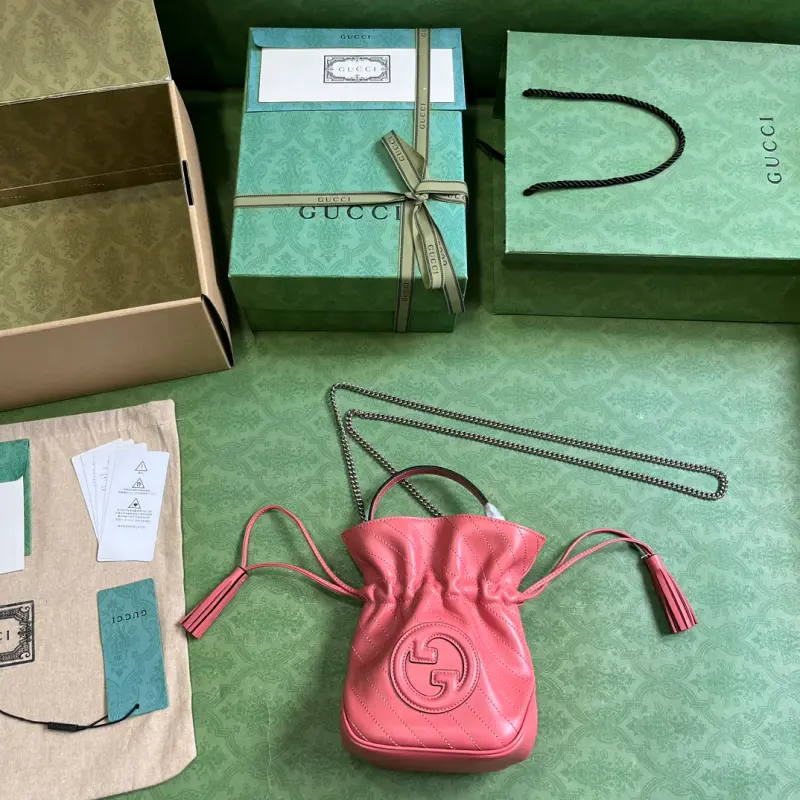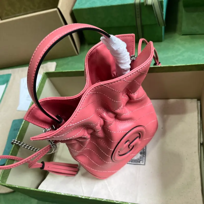 [Includes full original green box packaging] Gbag Blondie mini bucket bag. The Gbag Blondie collection exudes a subtle and understated vibe, featuring one of the brand’s boldest patterns and tonal leather. The collection ingeniously incorporates the circular, geometric Interlocking GG motif, showcasing Gbag’s modern aesthetic. The brand’s signature detail adds a touch of flair to this pink leather mini bucket bag, embellished with tassels. Made of pink leather with a taffeta lining, it features a circular Interlocking GG leather patch, leather tassels, a top handle (8cm drop), and a detachable chain shoulder strap (55cm drop) with a drawstring closure. Model No. 760313. Dimensions: 19cm (length) x 15cm (width) x 8cm (depth). Color: Pink/Original Leather.