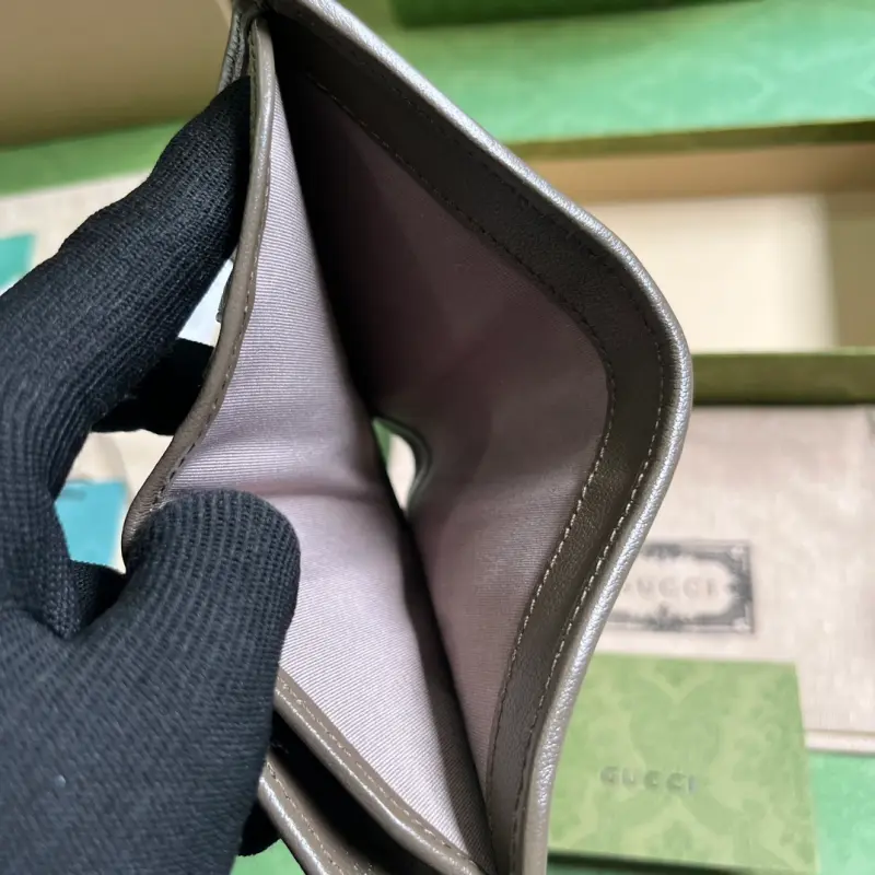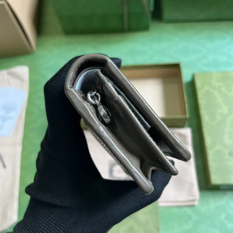 [Includes full original green box packaging] Gbag Blondie card holder. The Gbag Blondie collection features one of the brand’s boldest patterns paired with tonal leather, exuding a subtle and understated vibe. The collection ingeniously incorporates the circular, geometric Interlocking GG logo, showcasing Gbag’s modern aesthetic. This gray leather card holder features a prominent Interlocking GG detail. Made of gray leather with a taffeta lining, it features a circular Interlocking GG leather patch. The interior includes five card slots, an open pocket, and a zippered pocket with a snap closure. Weight: Approximately 0.2 kg. Model No. 760317. Dimensions: 8.5 cm (length) x 11 cm (width) x 3 cm (depth). Color: Gray/original leather.