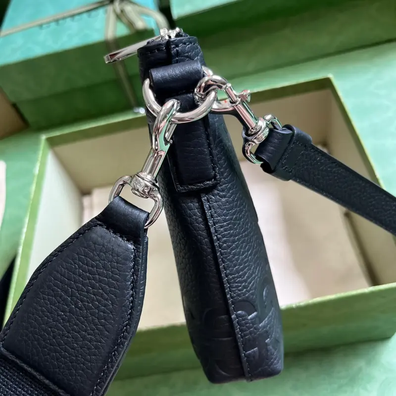 [Includes full original green box packaging] Small Super Double G messenger bag. Gbag transforms heritage, creativity, and innovation into a vibrant collection. From staple pieces to statement accessories, from everyday wear to special occasion pieces, the brand’s beloved patterns add color to its new leather goods. This messenger bag, expertly crafted from black Super Double G leather, represents a fresh take on the luggage collection. Black Super Double G leather with a cotton and linen lining. Interior: one zippered pocket with zip closure. Model No. 761747. Dimensions: 23cm (width) x 16.5cm (height) x 4.5cm (depth). Color: Black/Original G Embossed Leather.